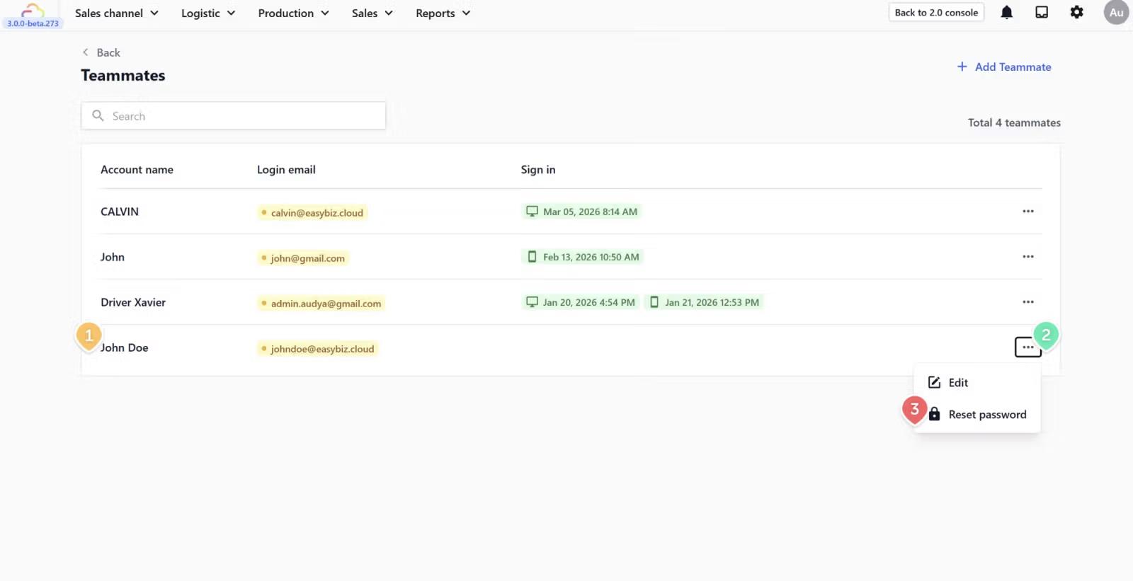 EasyBiz does not send an invite email automatically. The owner sends it from the teammate's profile.