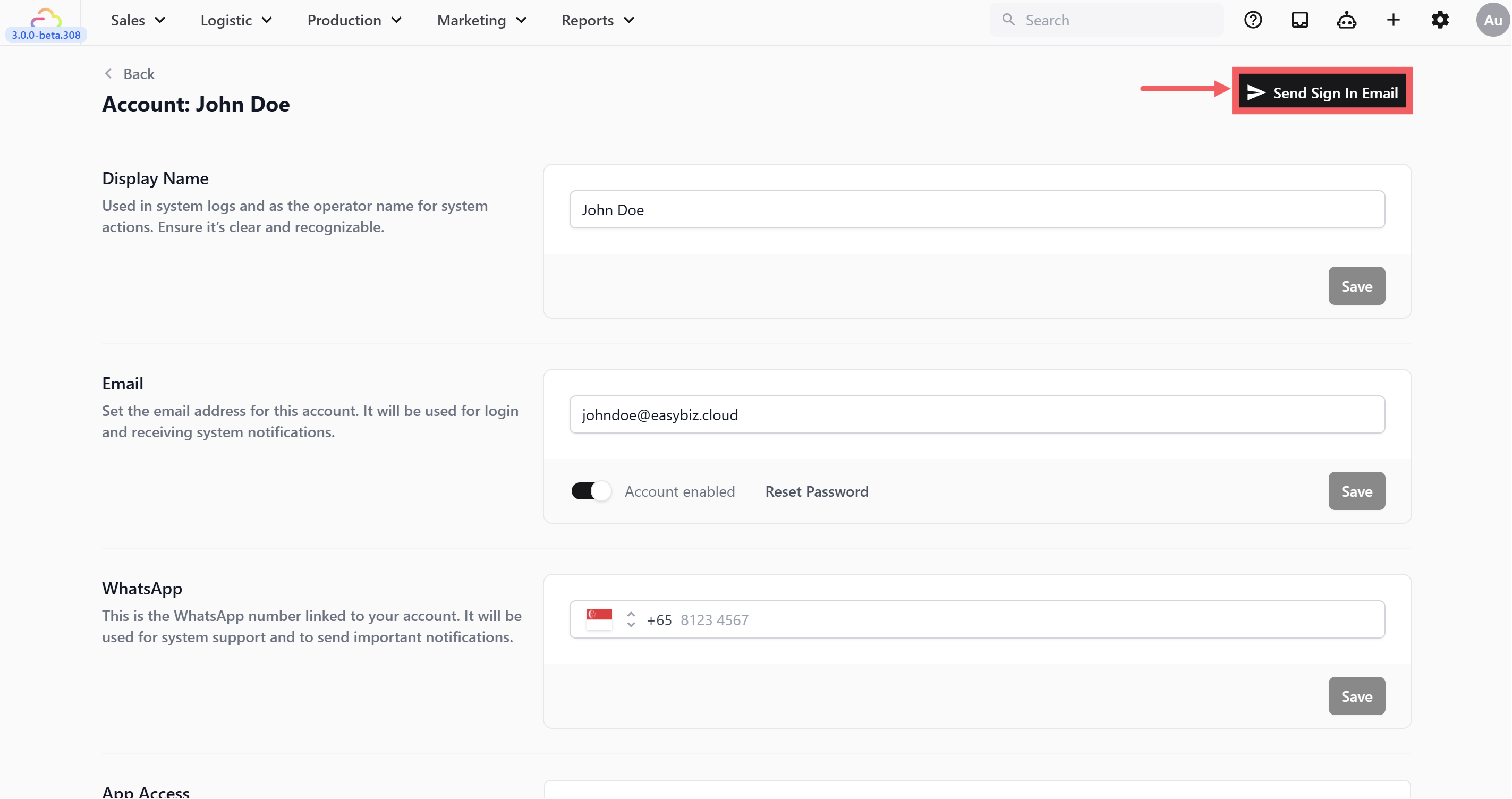 - Click Send Sign In Email in the top-right corner of the profile page.