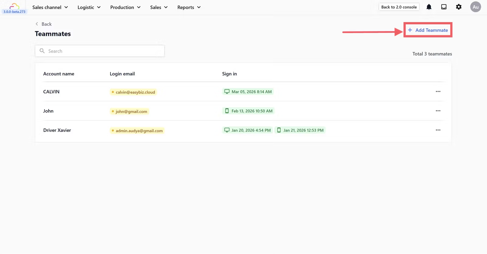 If the Add Teammate button is not visible, you do not have Manage Billing. Sign-in as the main account or ask the owner to grant it.
