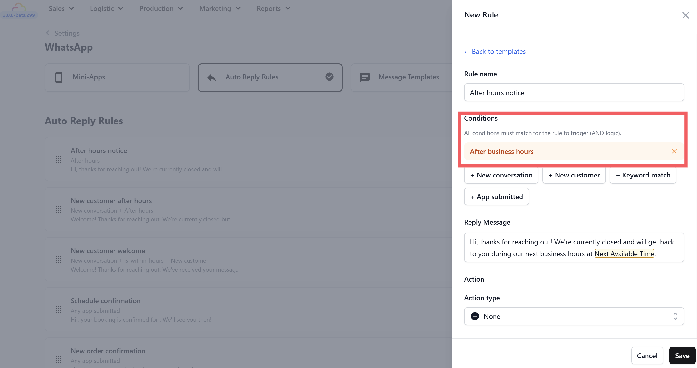 - Business Hours must be enabled and configured in WhatsApp General Settings. This rule uses the "After business hours" condition.