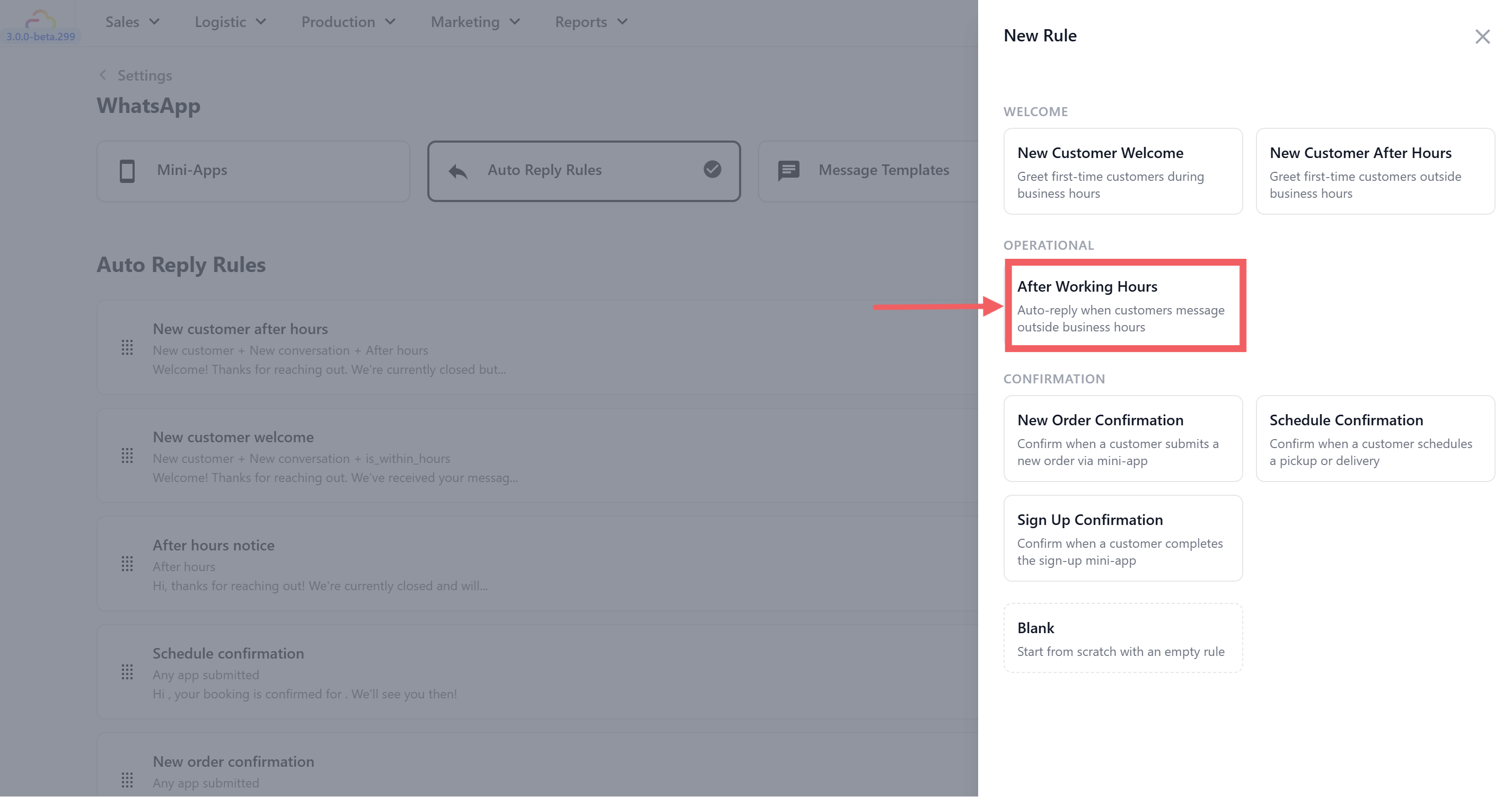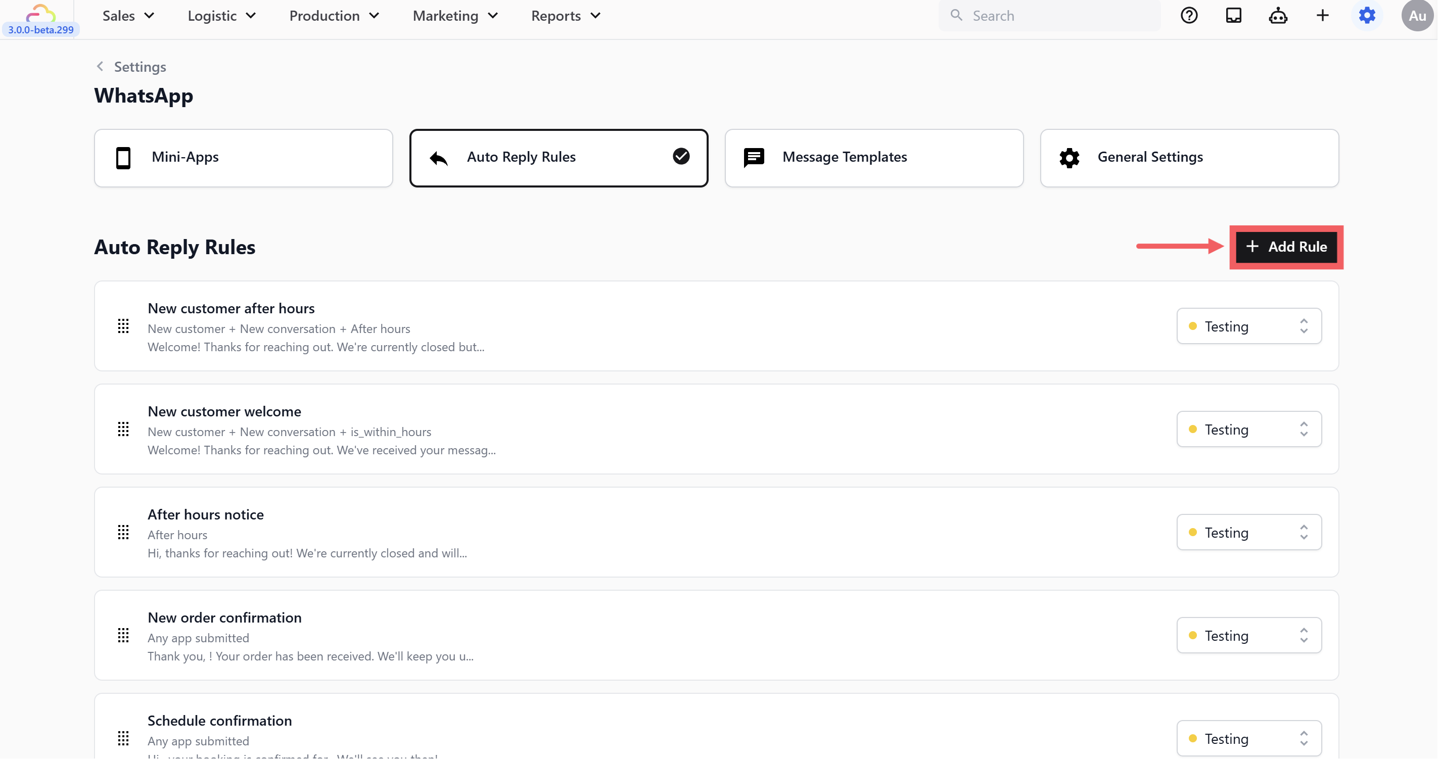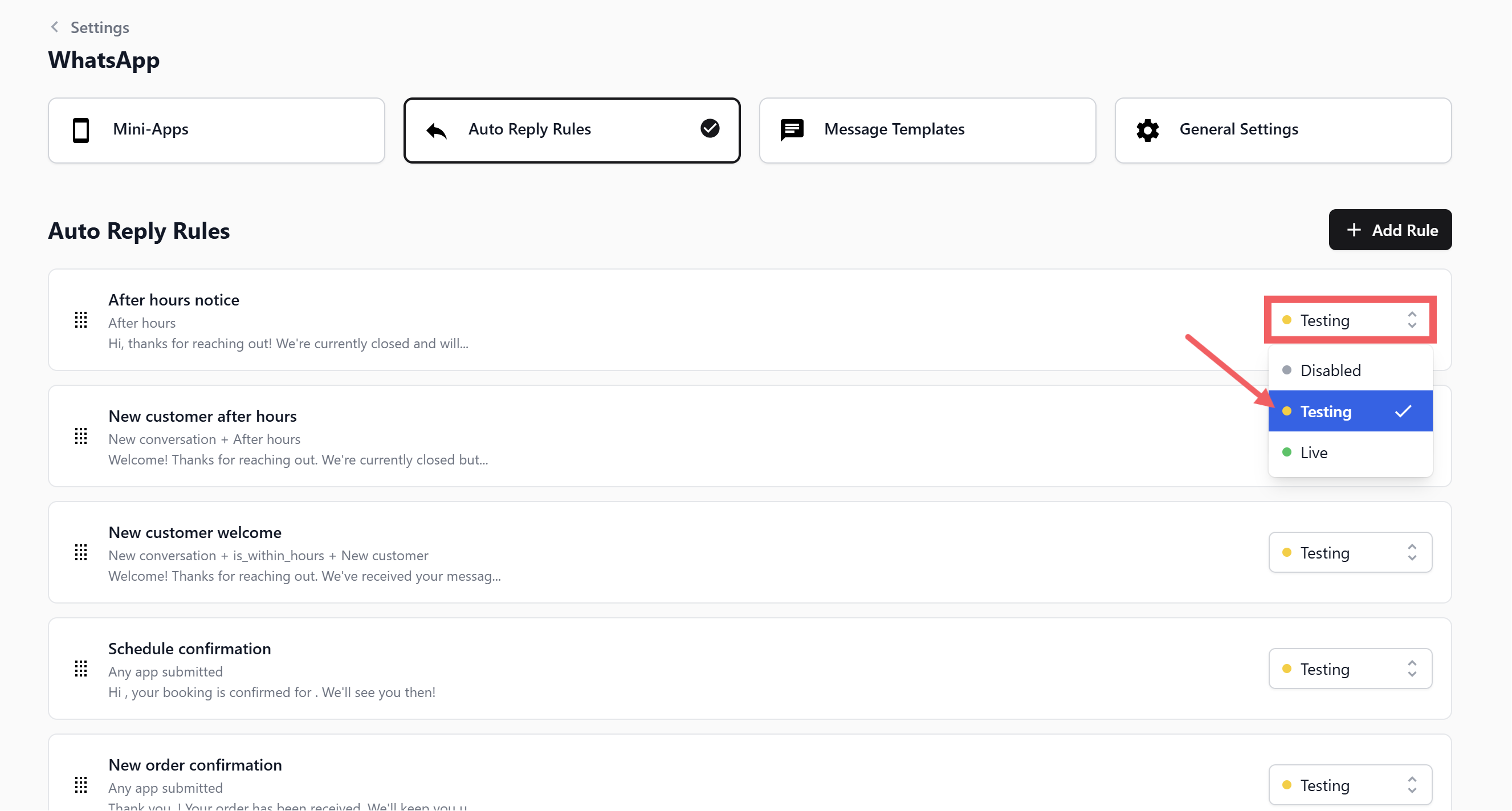 - Go to WhatsApp Settings > Auto Reply Rules tab