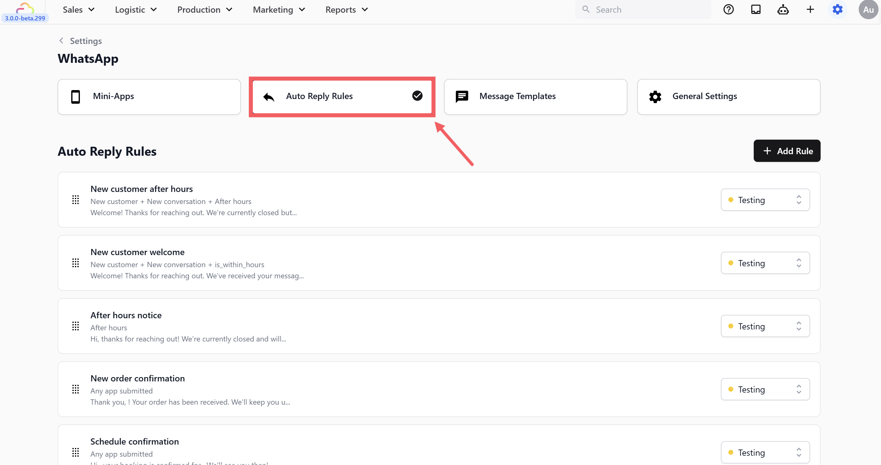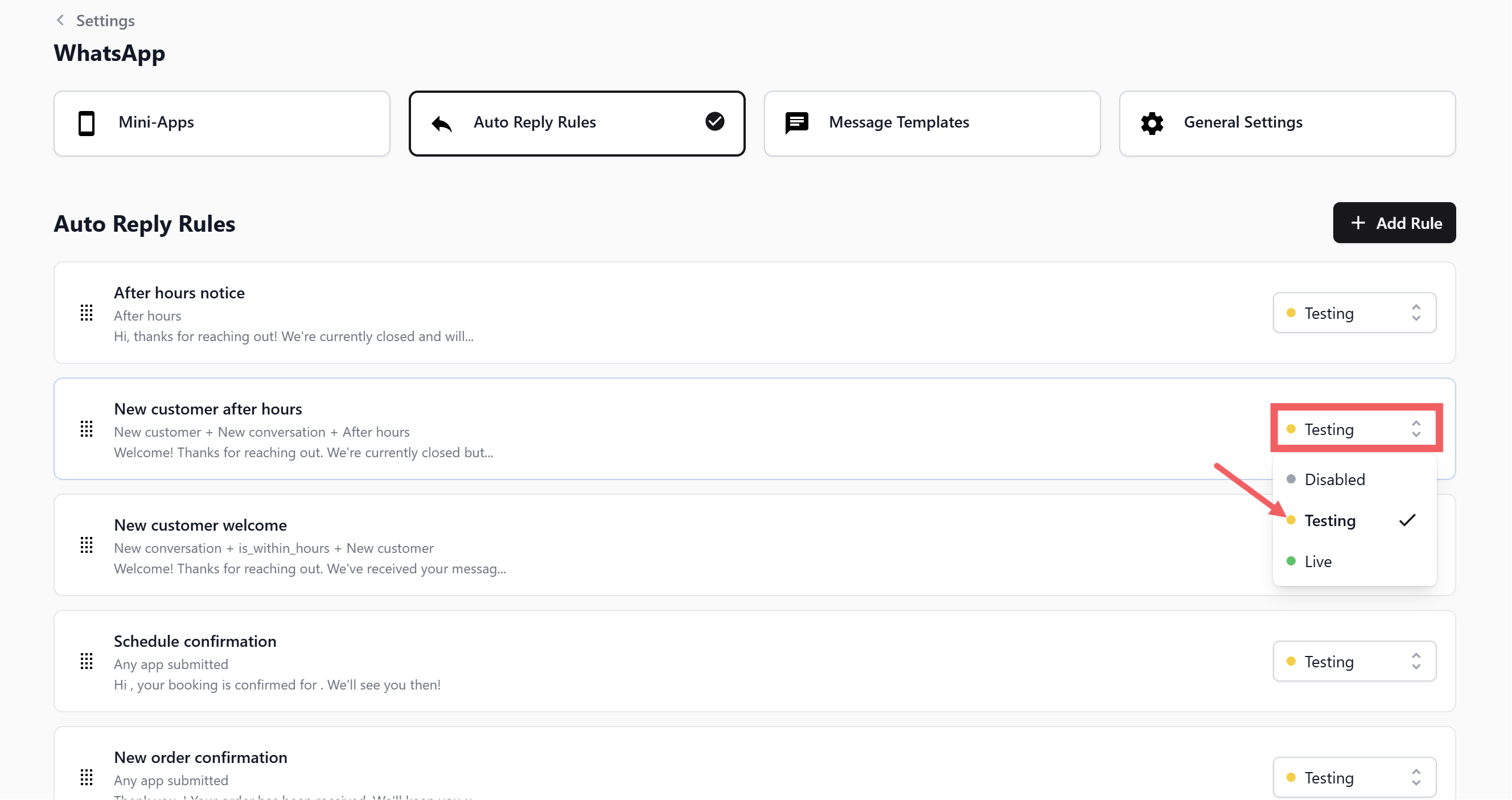 - Go to WhatsApp Settings > Auto Reply Rules tab