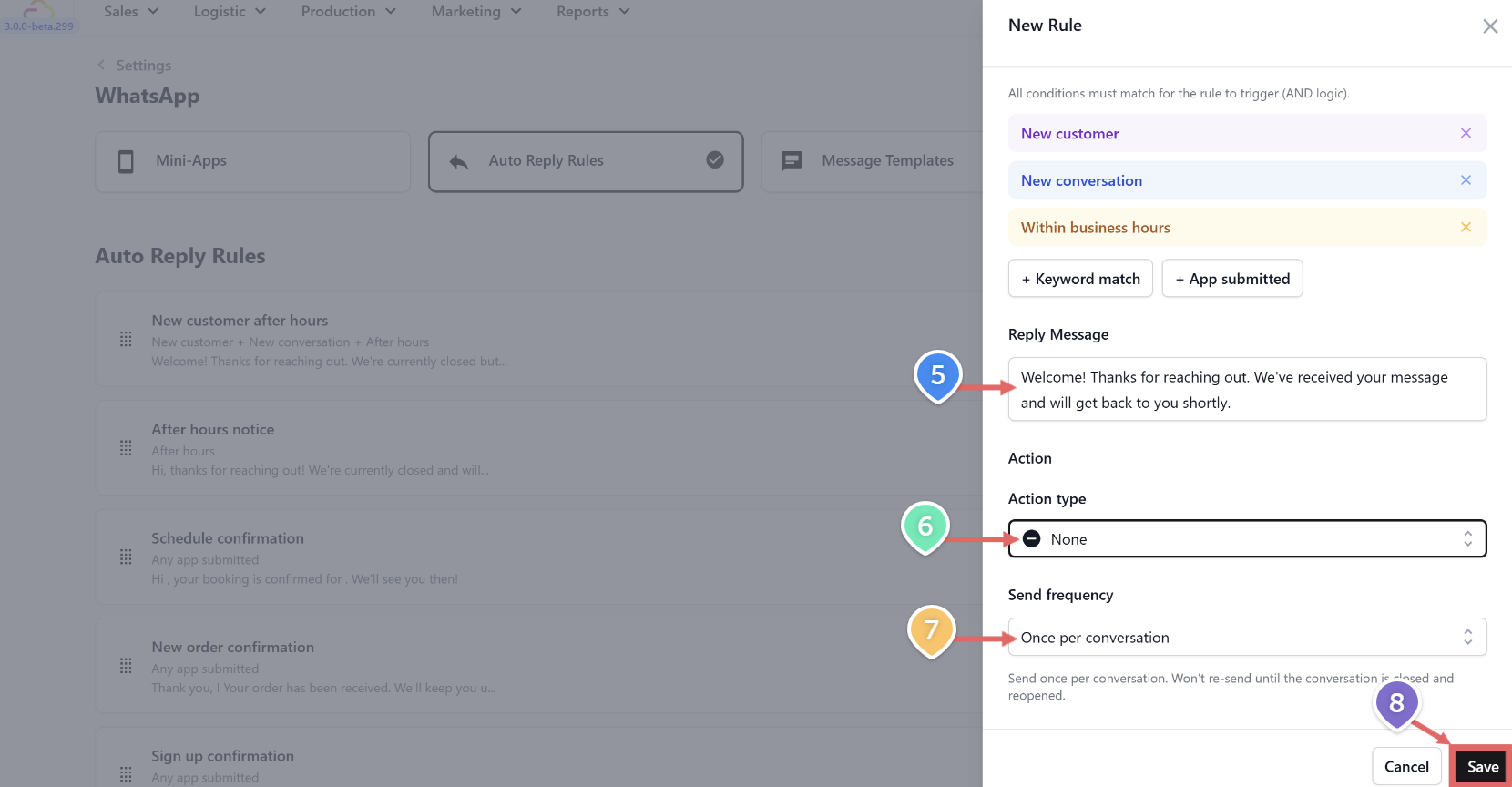 - Go to WhatsApp Settings > Auto Reply Rules tab