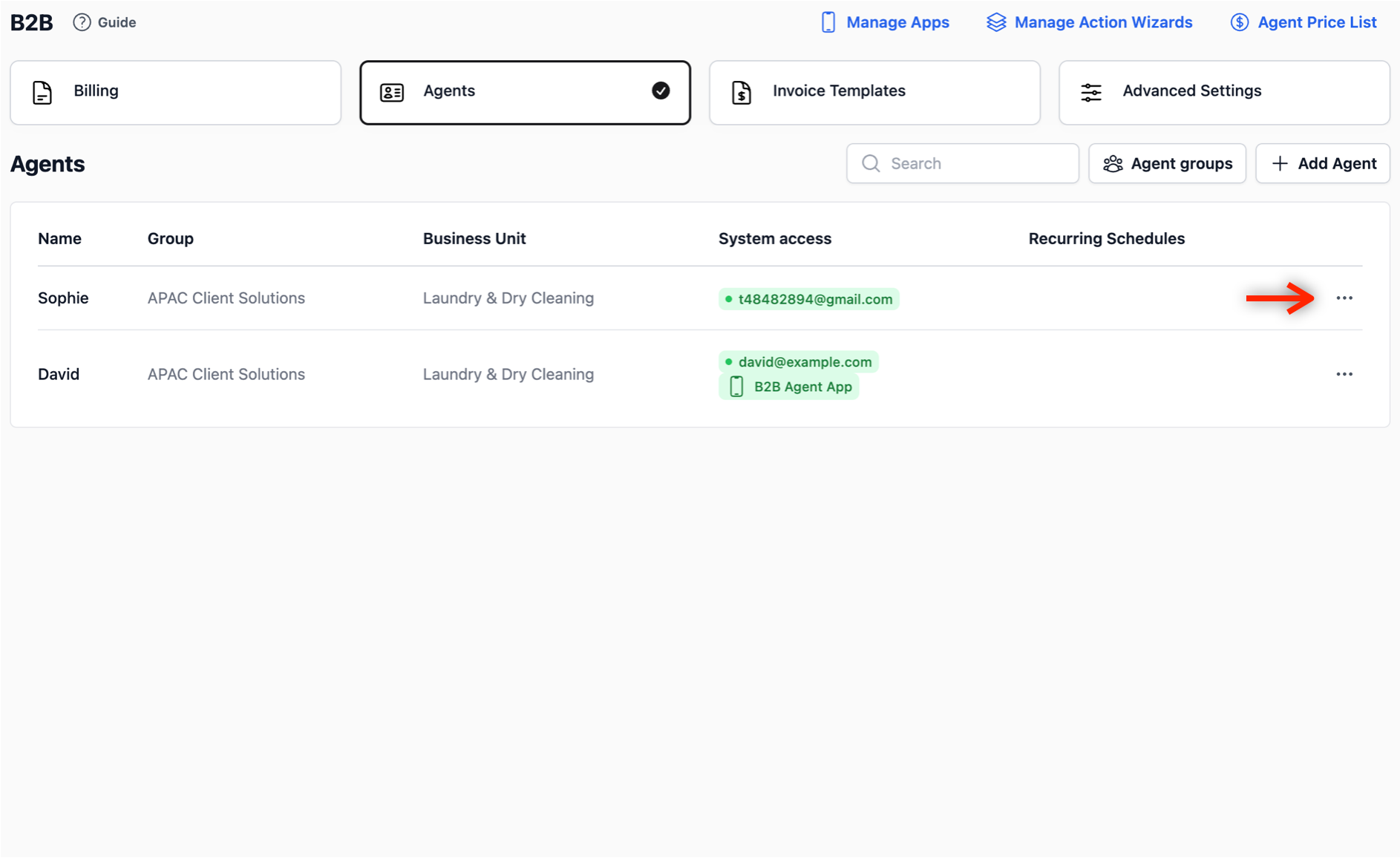 - Select the Agent: In the B2B page, click on the Agents tab. In the table view, locate the agent you want to grant access to the newly created agent app. Click on the ••• (Action Menu) on the far right, and select Edit.