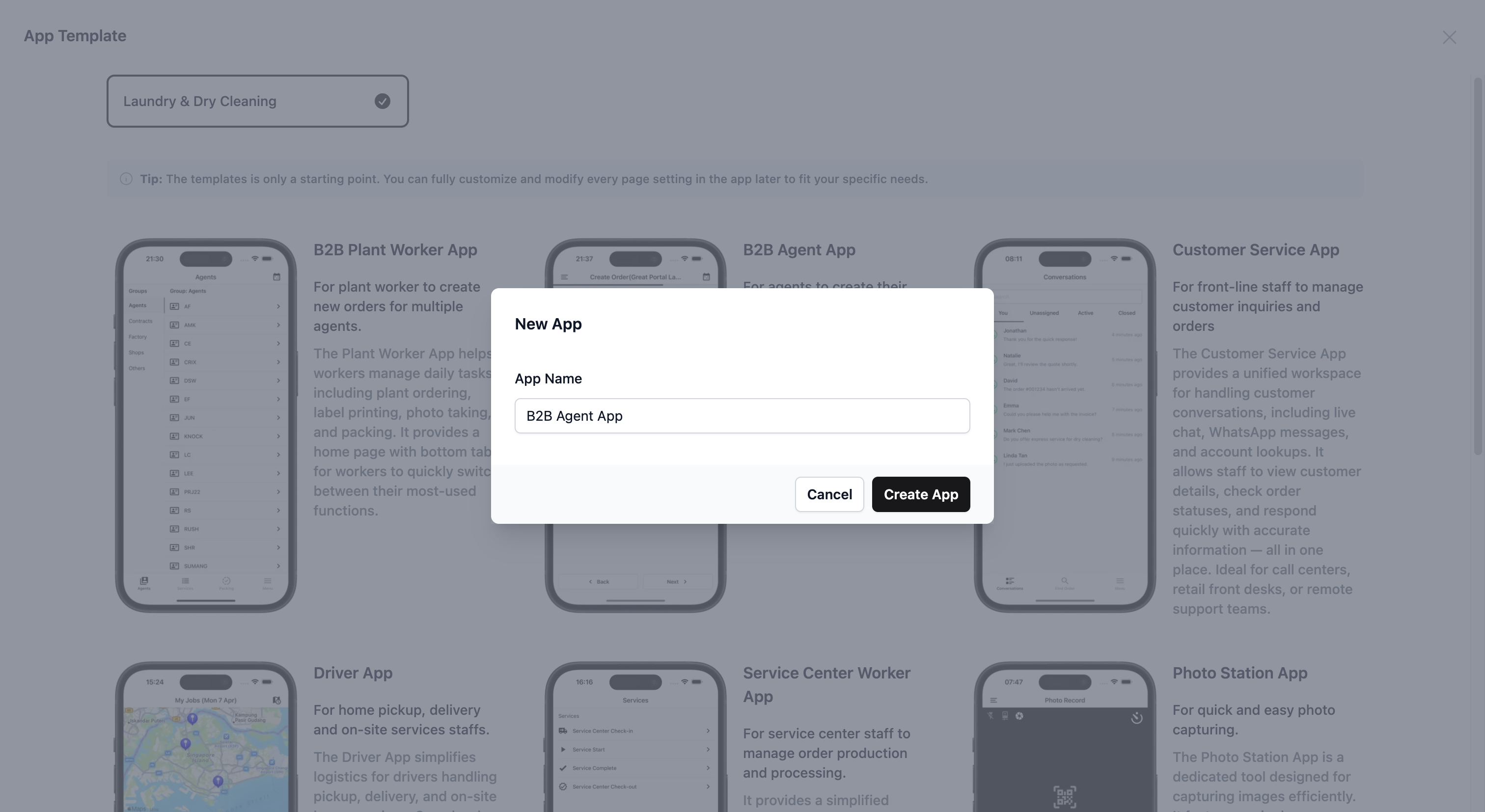 For this example, click on the B2B Agent App template. This will open up a pop-up field for you to change the name of your new agent app.