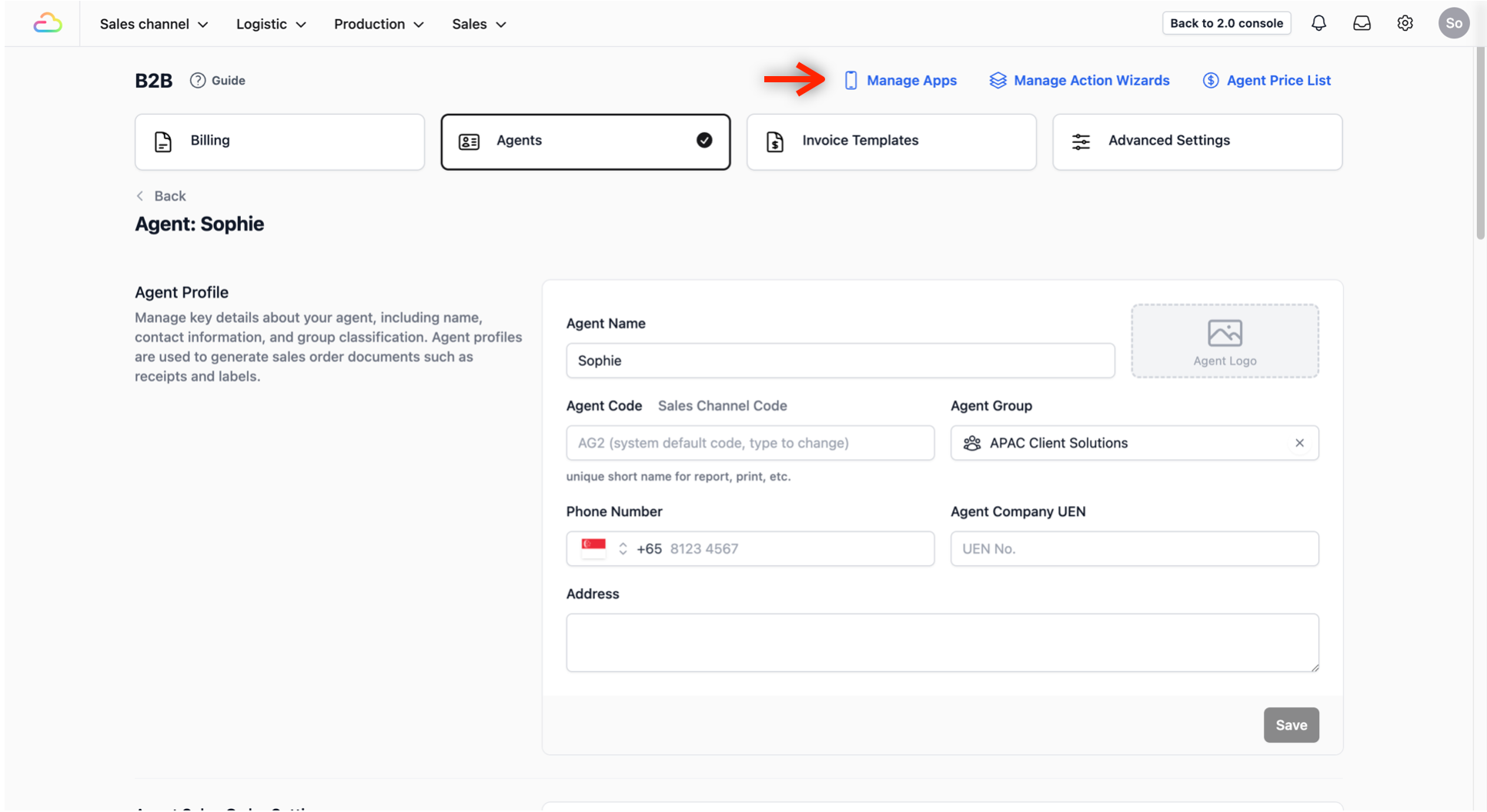 - If you are already on the B2B page: Simply click the Manage Apps button.