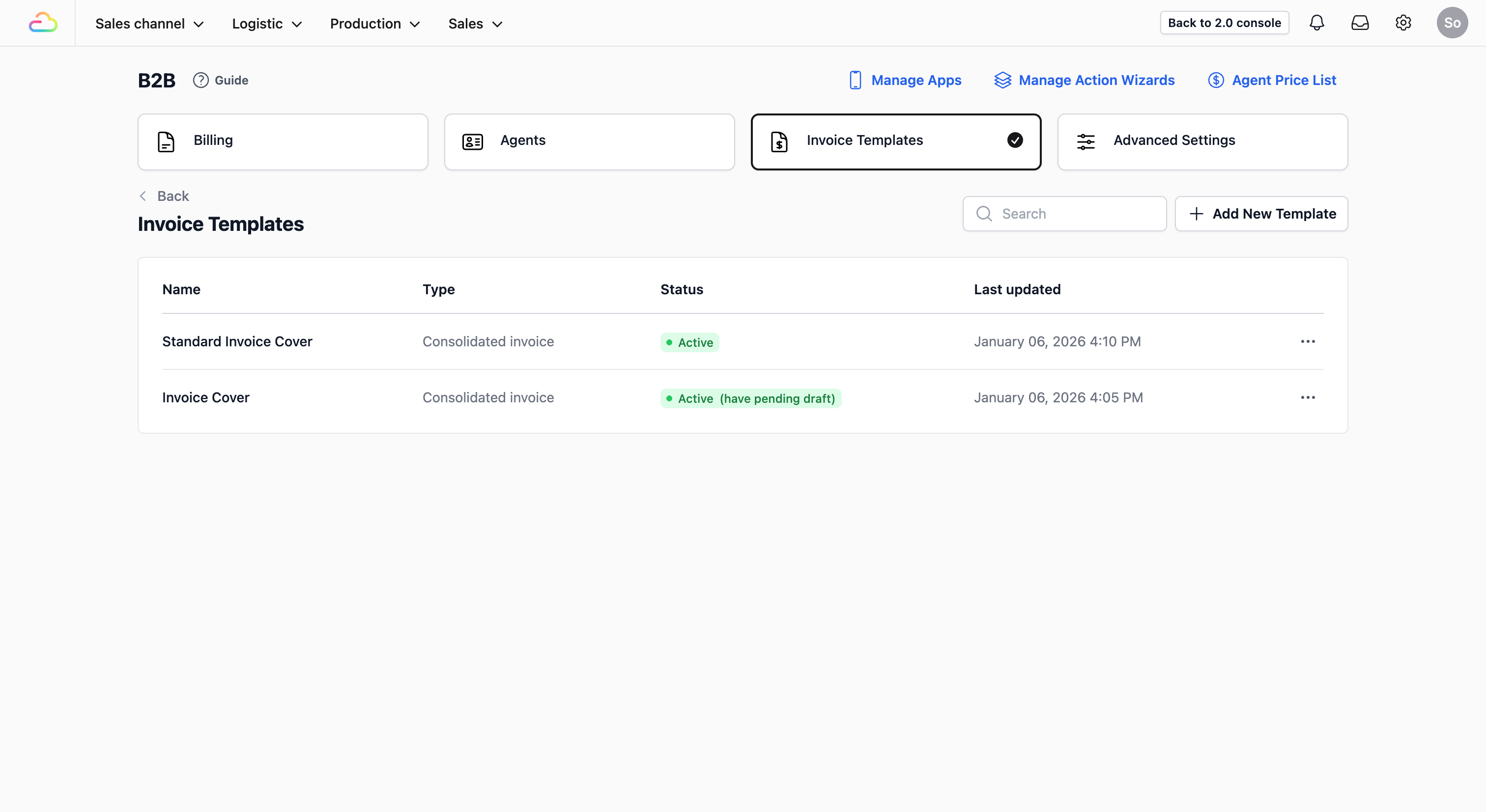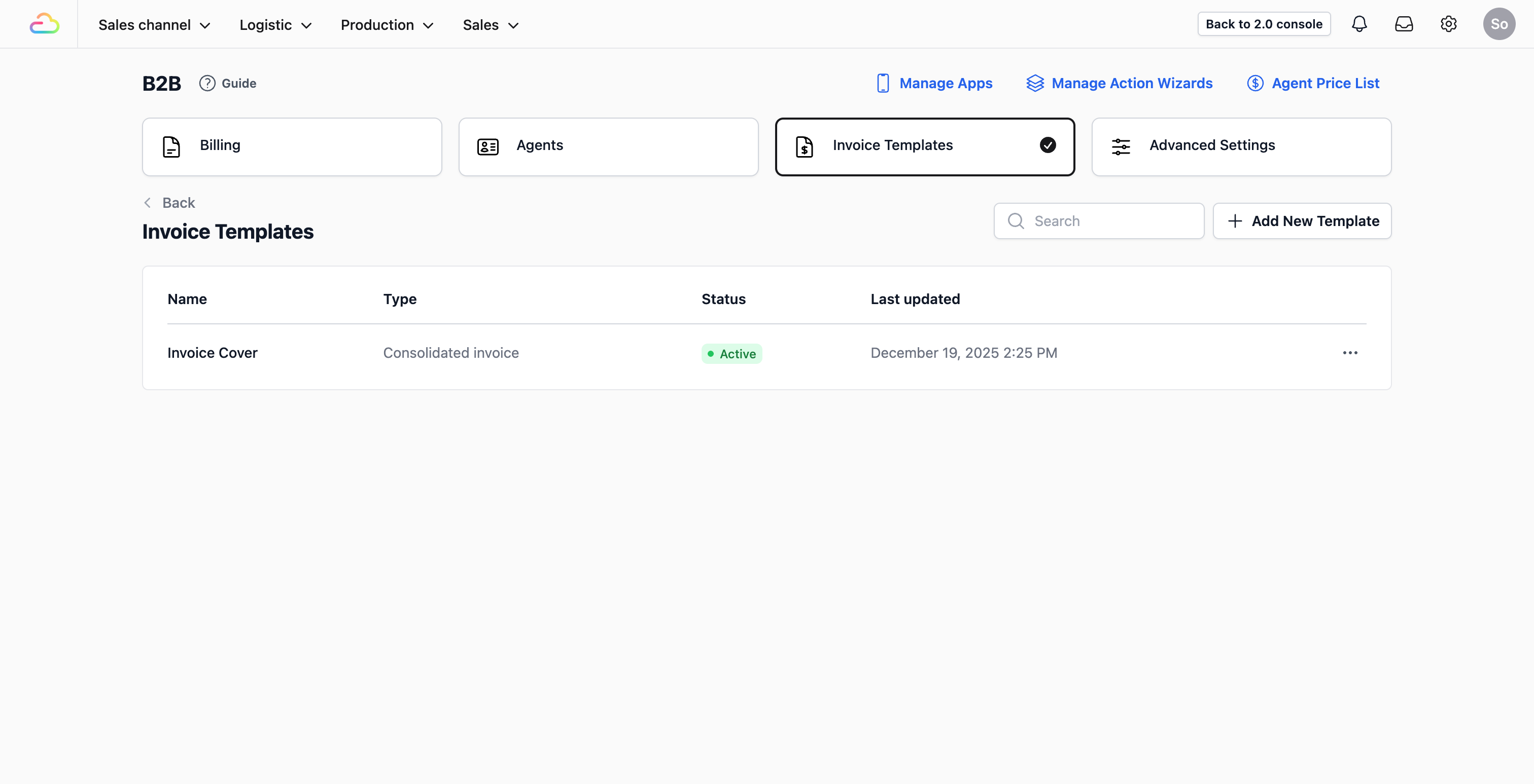 Once the B2B page loads, you will see several options at the top. Click on the Invoice Templates tab. This is where you will manage the invoices you send to your agents at the end of each month.