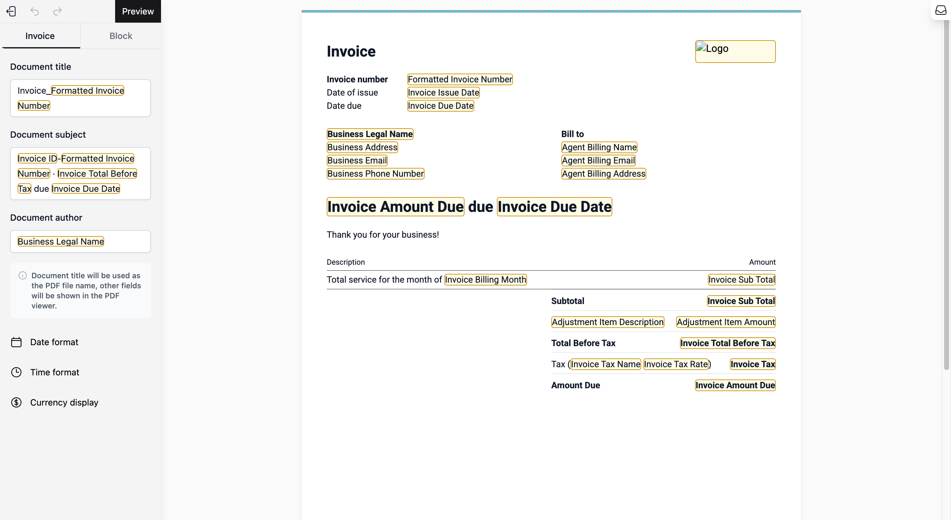 • Visual Editor (Left): This controls the high-level "logic" and metadata of your invoice. You can customise the Document Title (which serves as the PDF file name), the Document Subject, and the Document Author. You can also set your preferred Date, Time, and Currency formats to match your business standards.