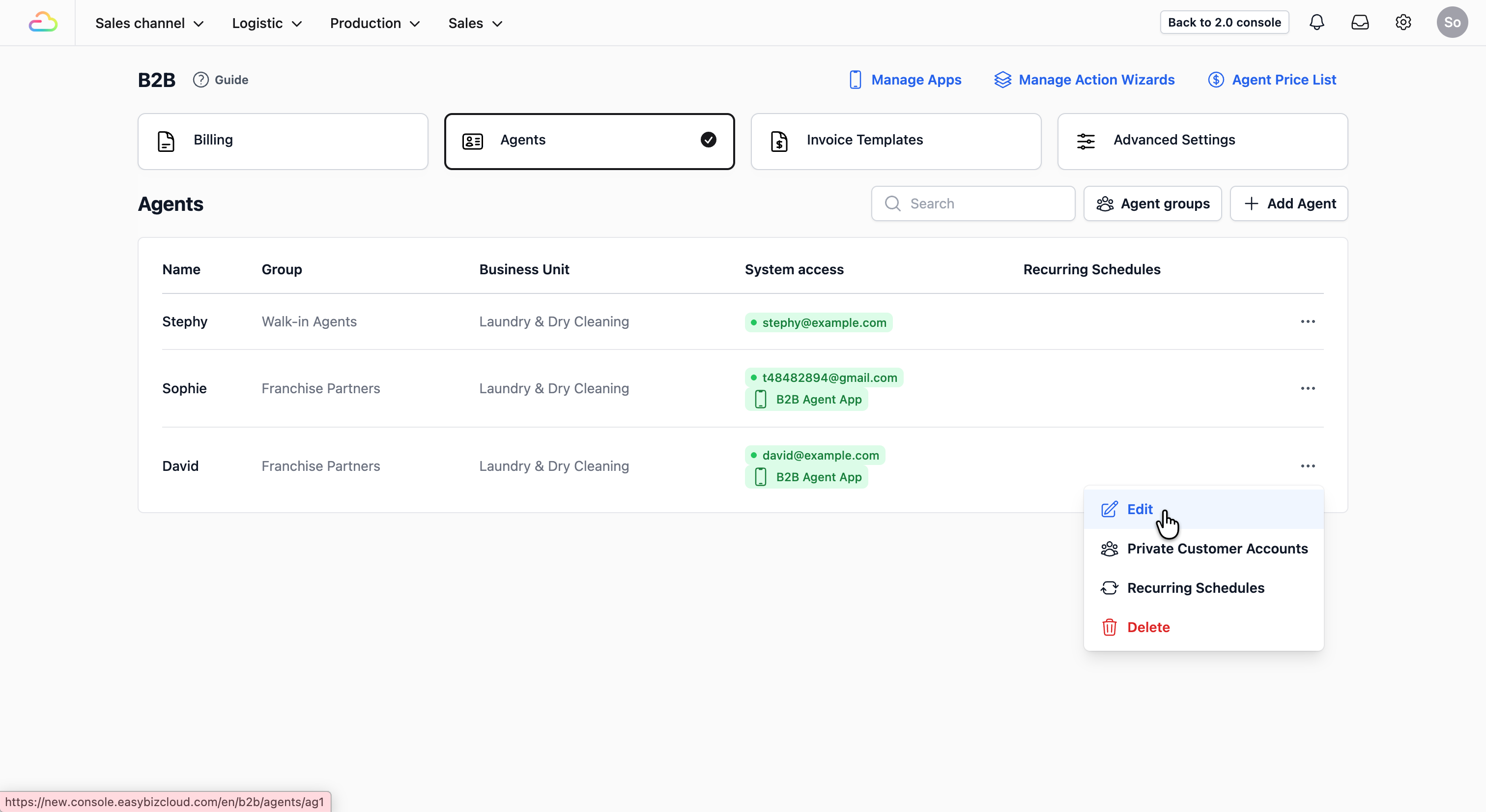 Click on the Agents tab to view your full list of registered agents. In the table view, locate the agent you want to apply the newly created invoice templates to and click on the ••• (Action Menu) on the far right, and select Edit.