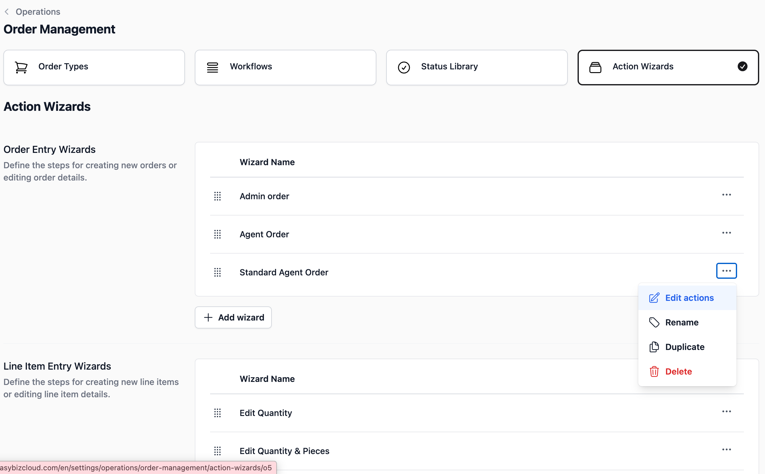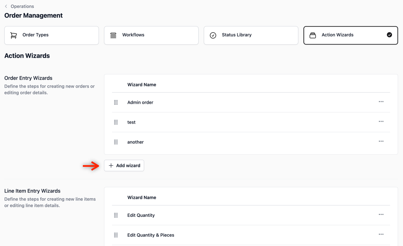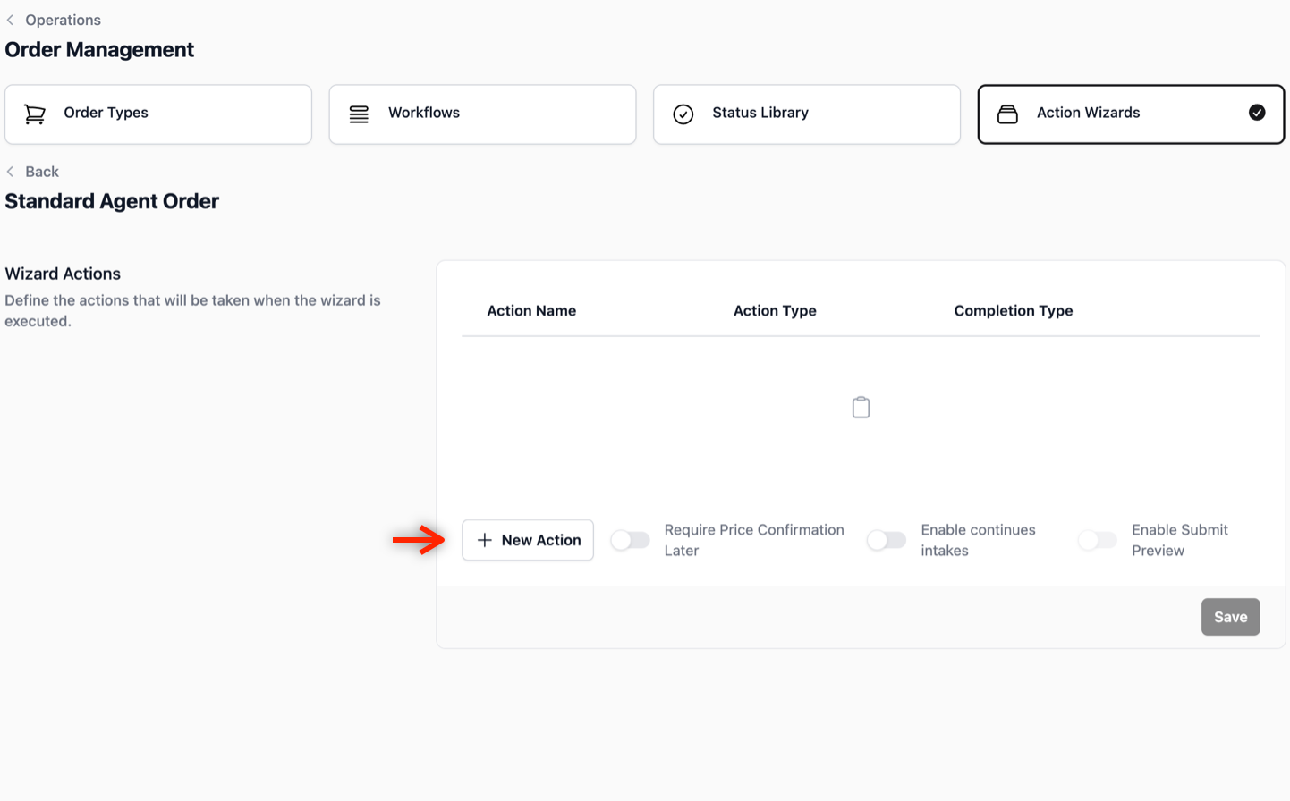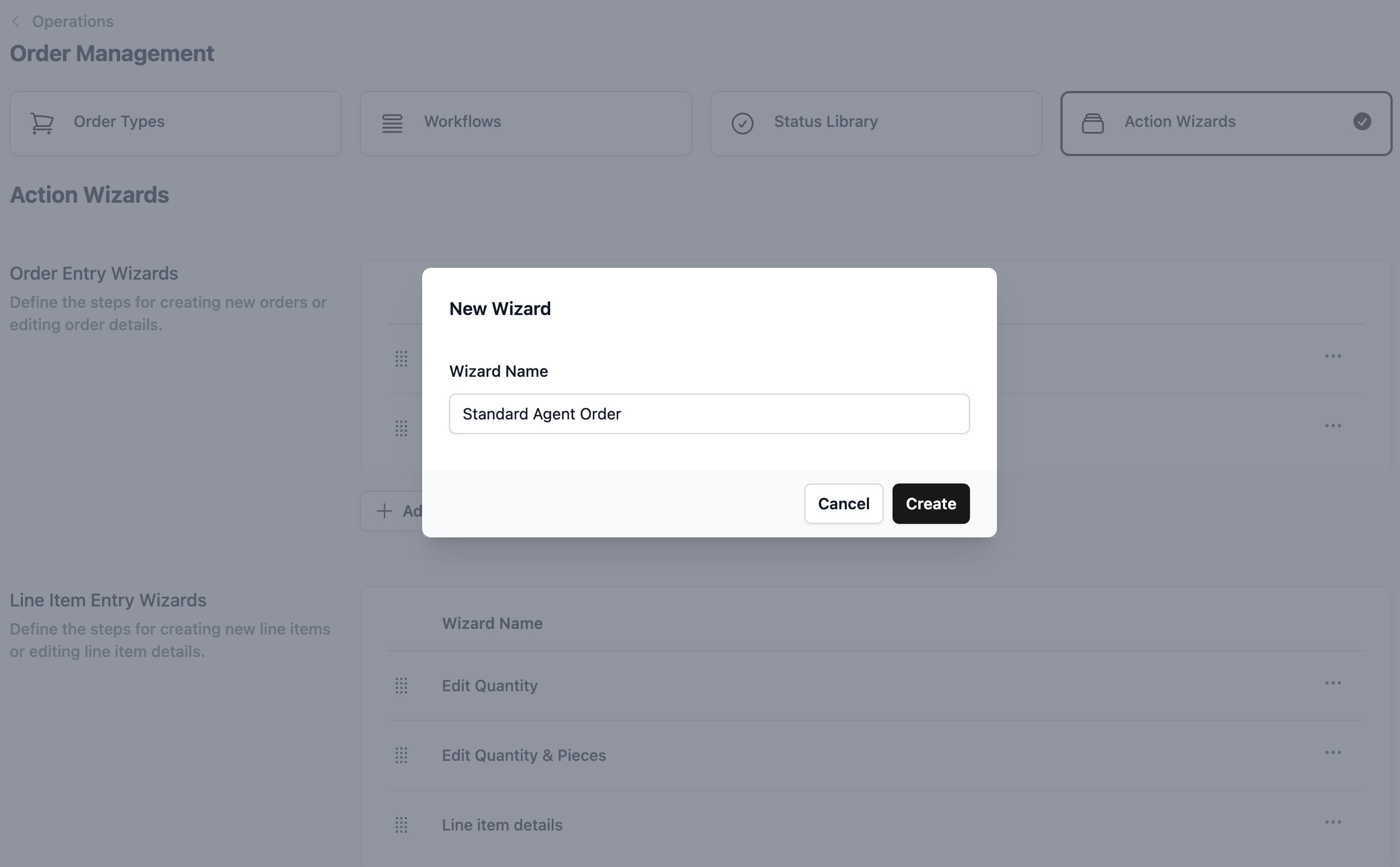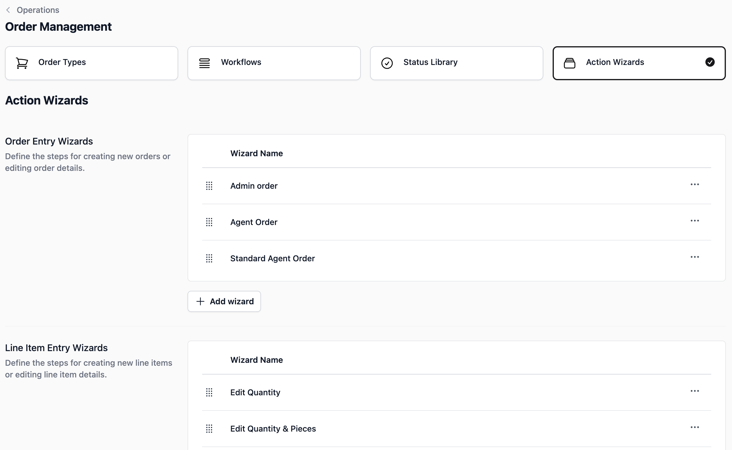- From any other screen: Click the Gear Icon (Settings) → Operations → Order Management. Click on the Action Wizards tab.