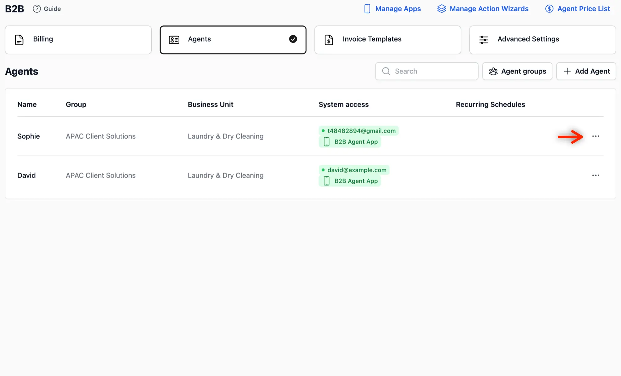 - Once you are on the B2B page, click on the Agents tab to view your full list of registered agents.