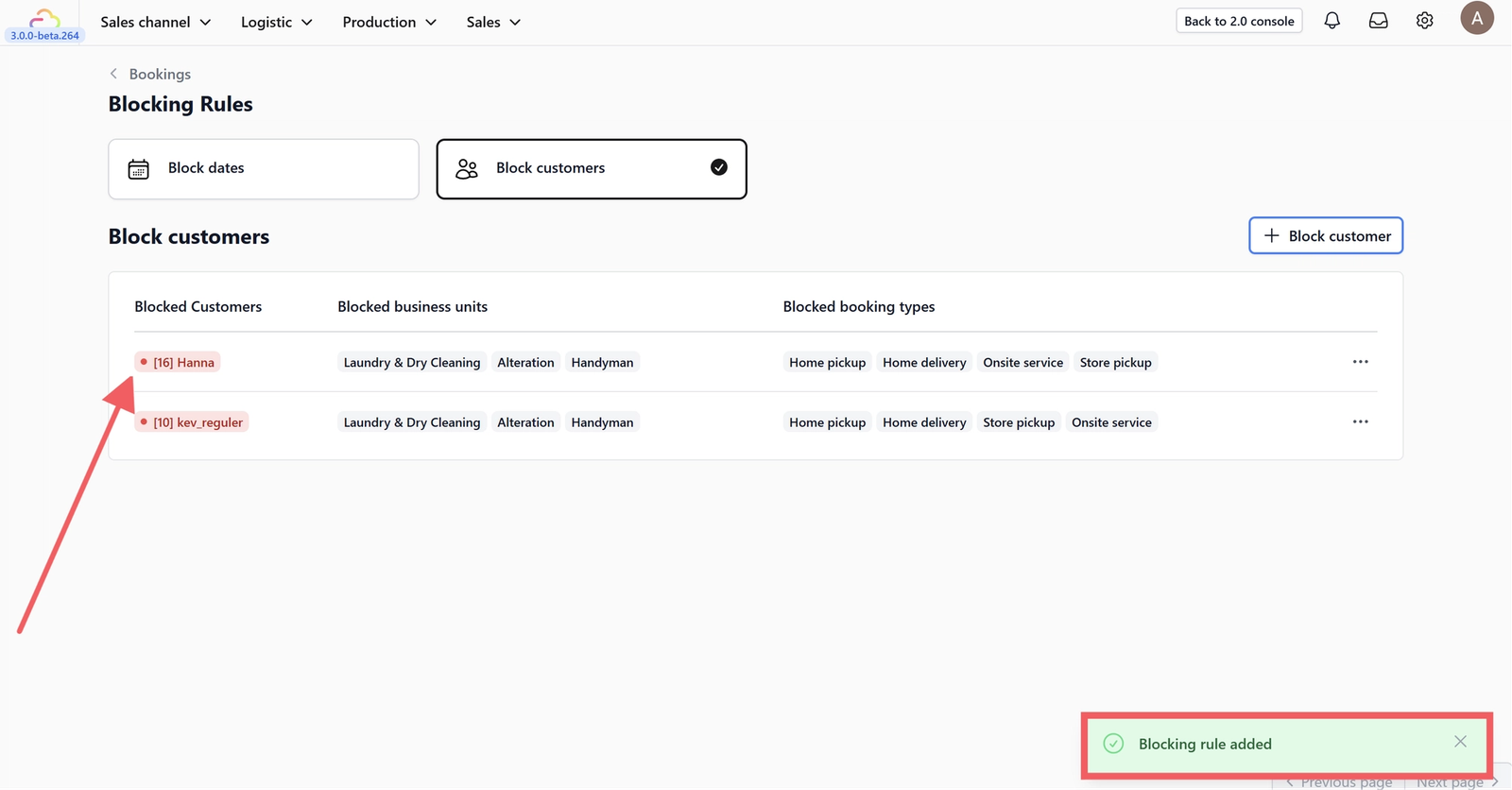 5. You will see a notification confirming that the blocked customer has been added.
