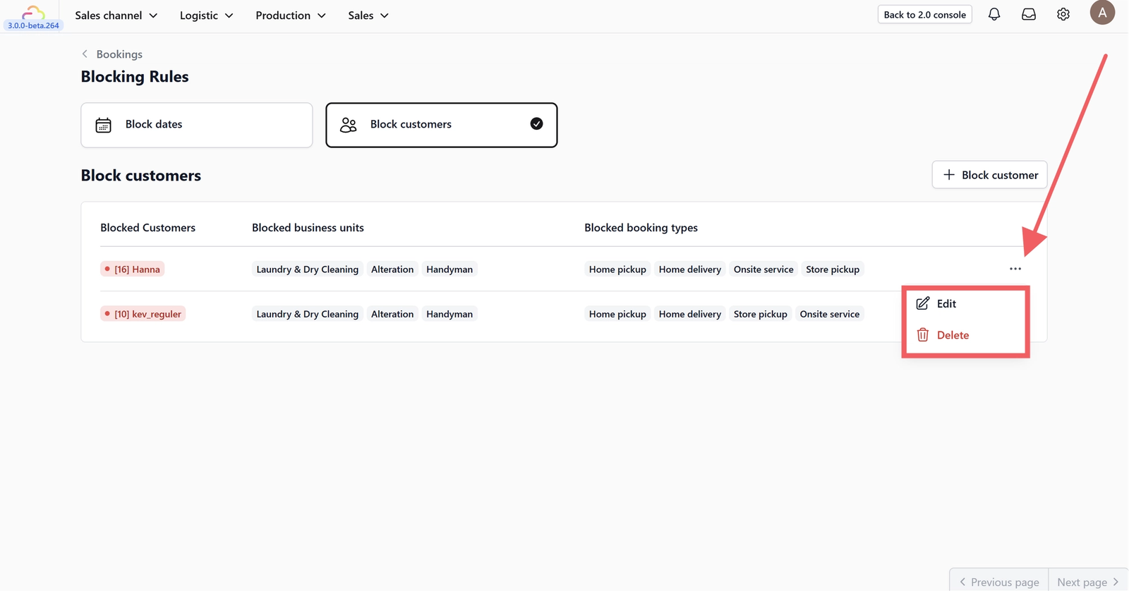6. Use the three-dot menu to edit or delete an existing blocked customer.