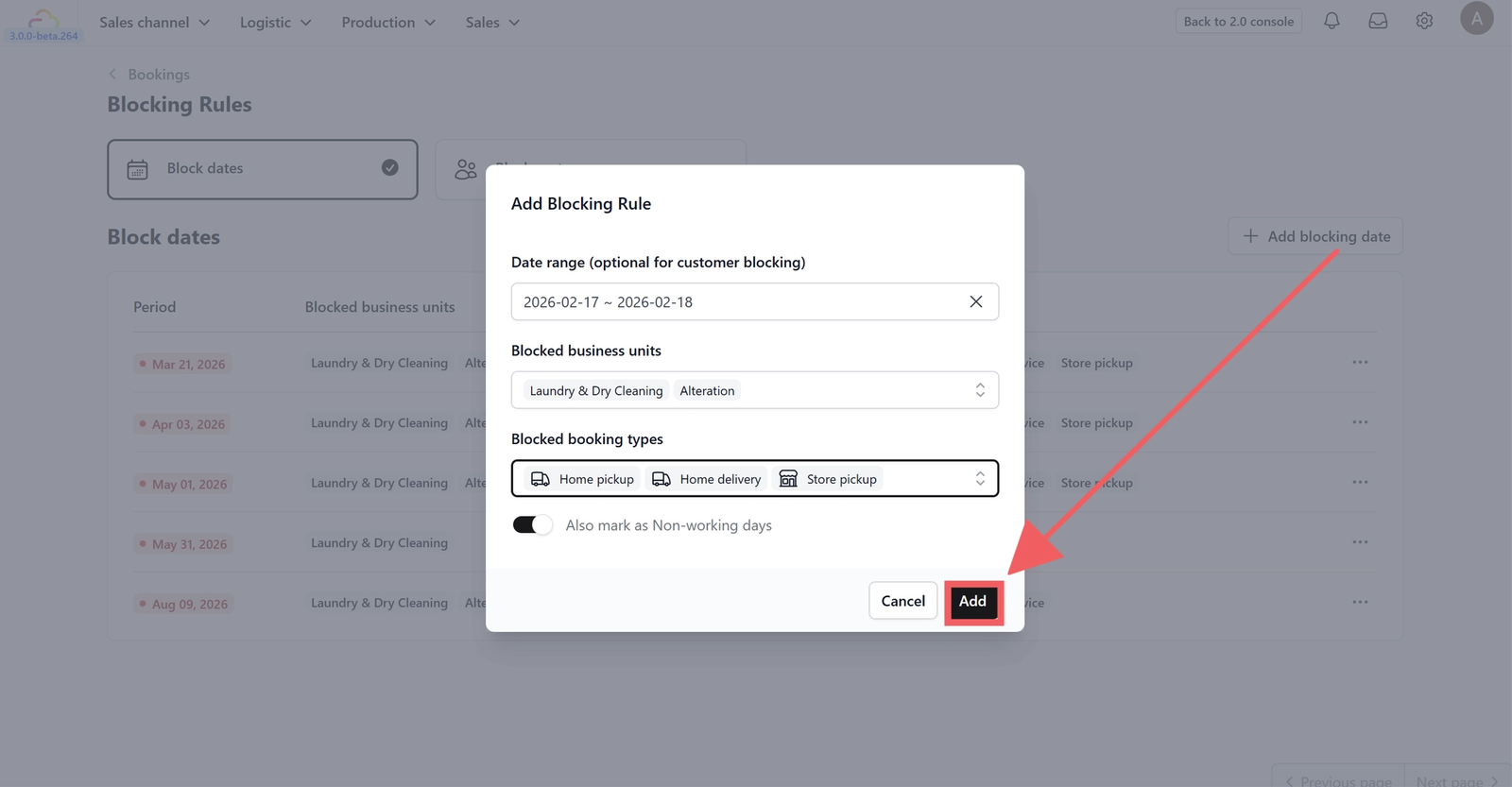 2. Click + Add Blocking Date.