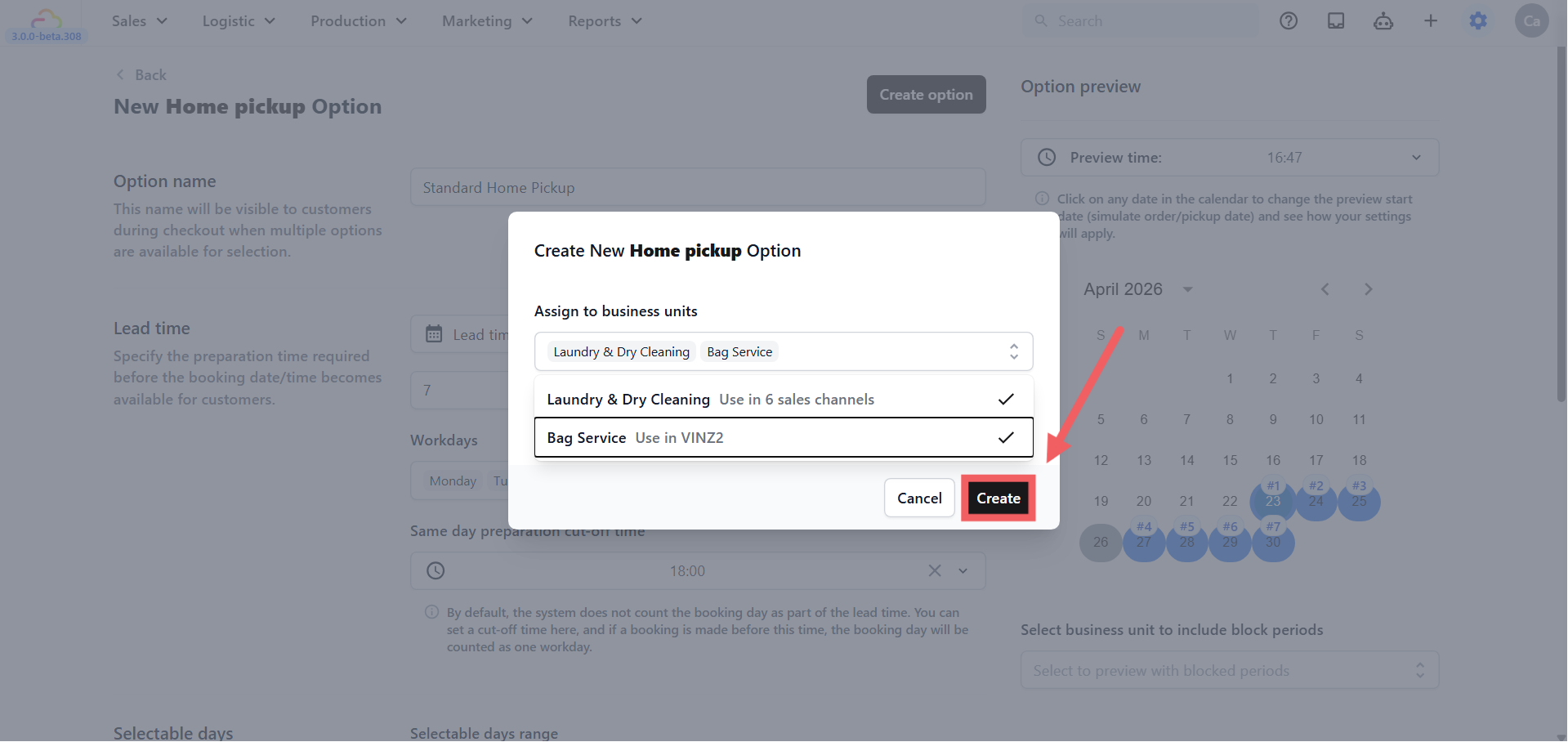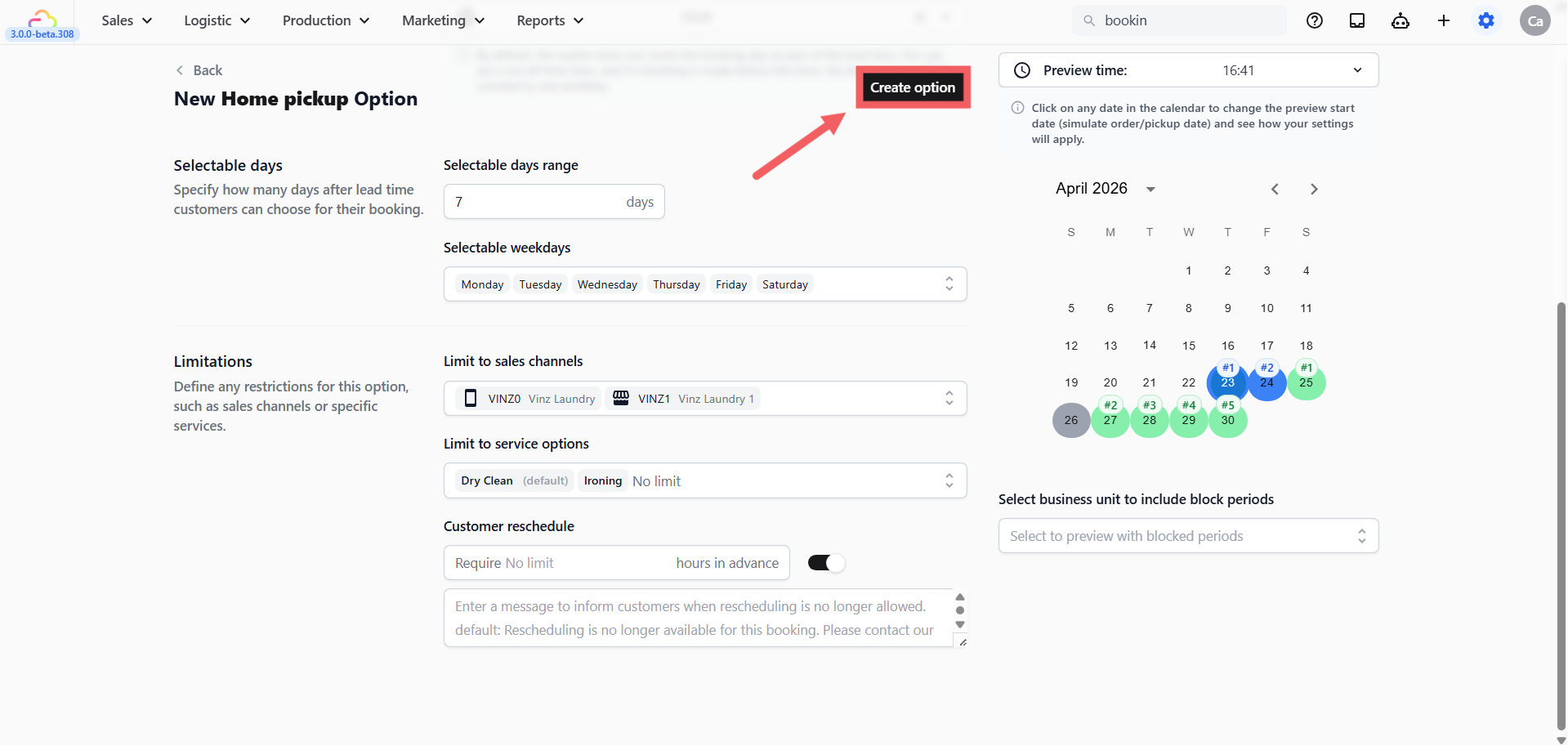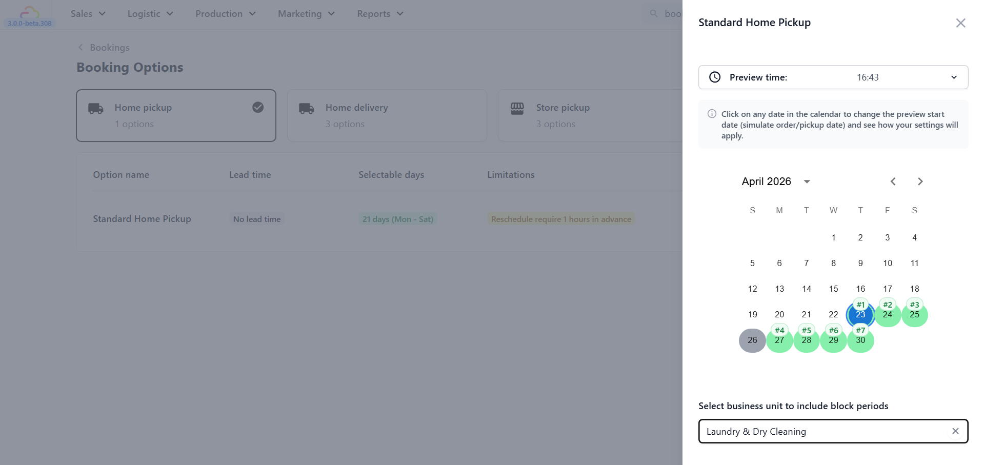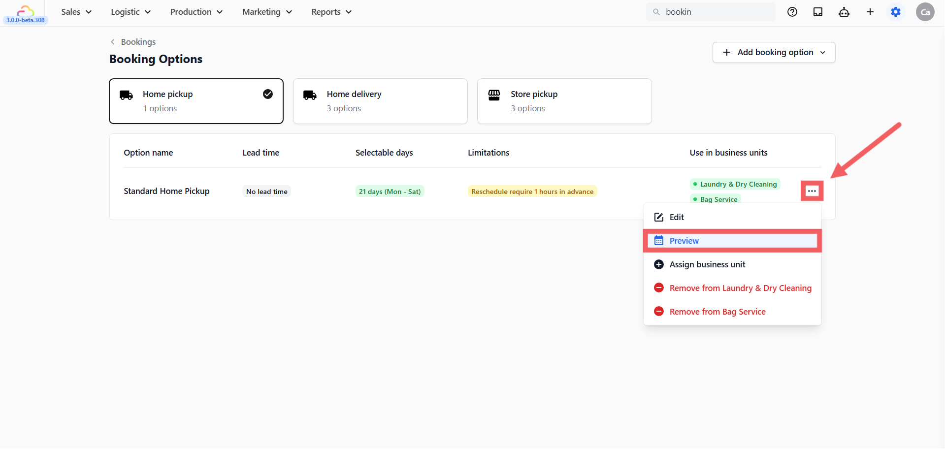 Once you have finished configuring your booking option — the type, lead time, surcharge, limits, and rescheduling rules — this article walks you through the final steps: saving, assigning to a business unit, previewing the calendar, and managing options after they go live.