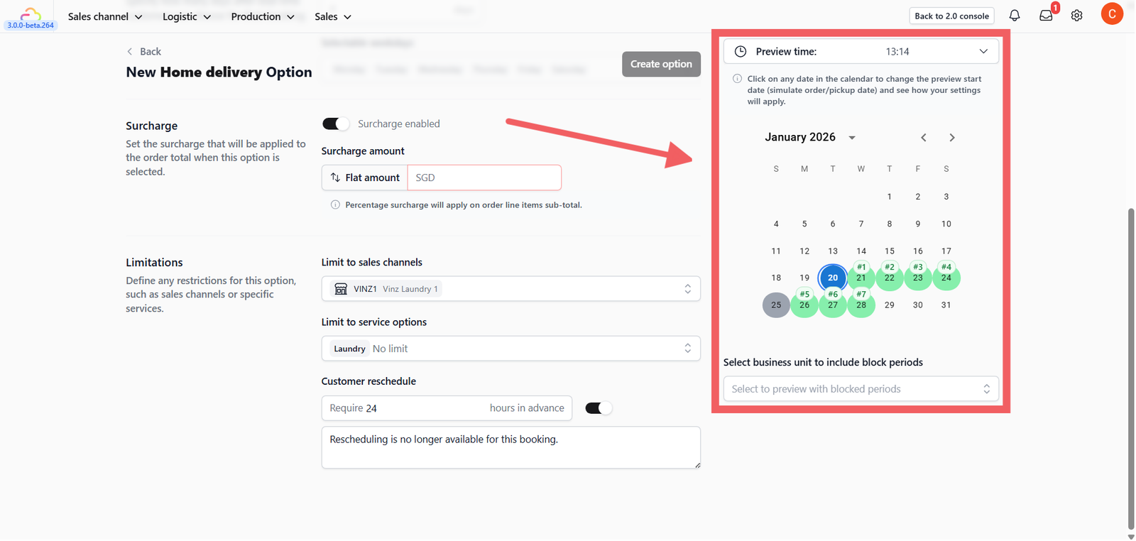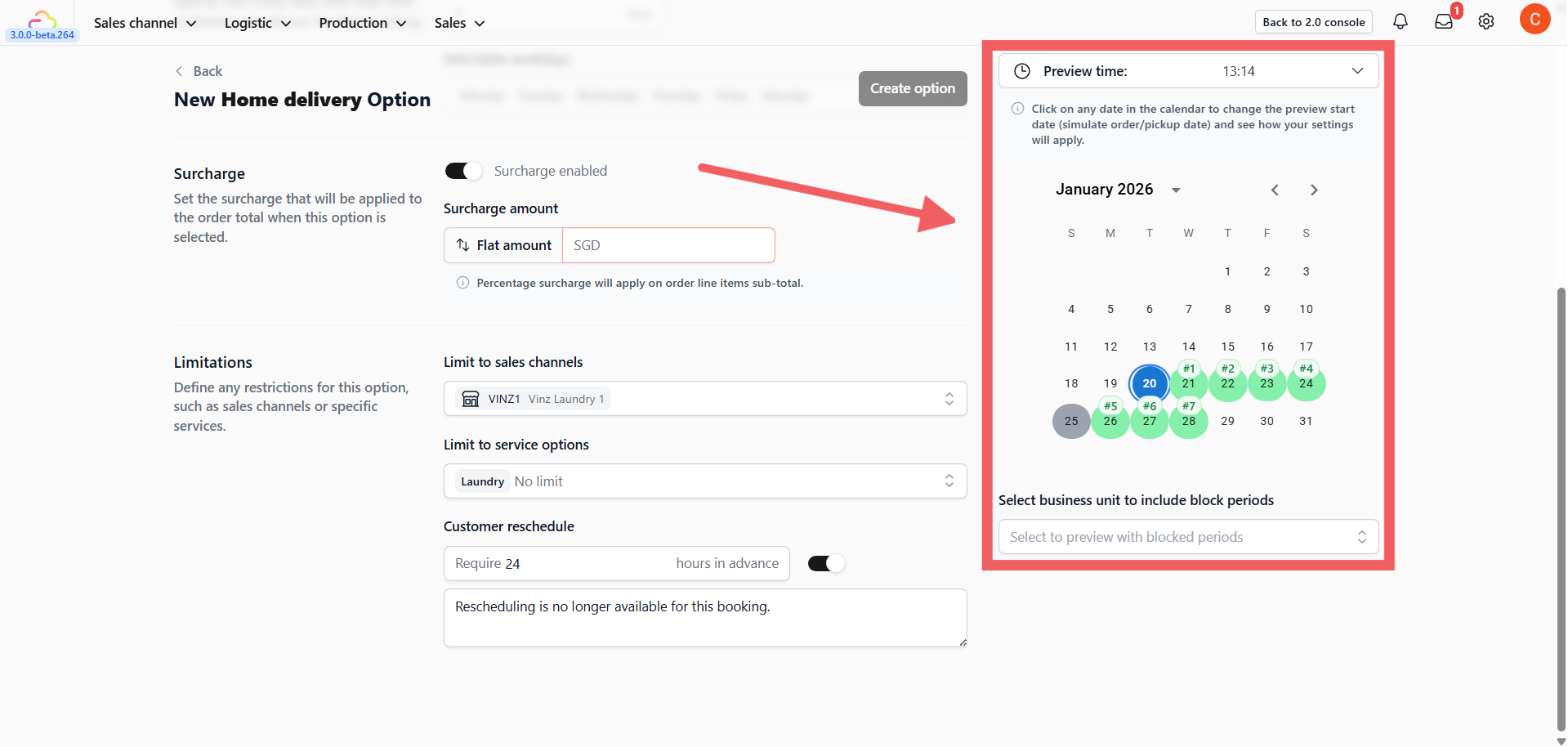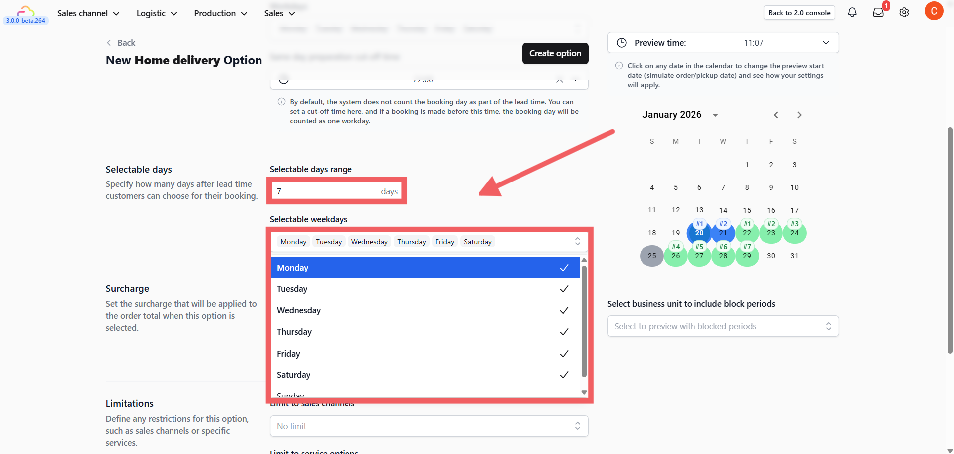 To see how public holidays or specific block-out dates affect this option, select your Business Unit in the dropdown menu below the preview calendar.