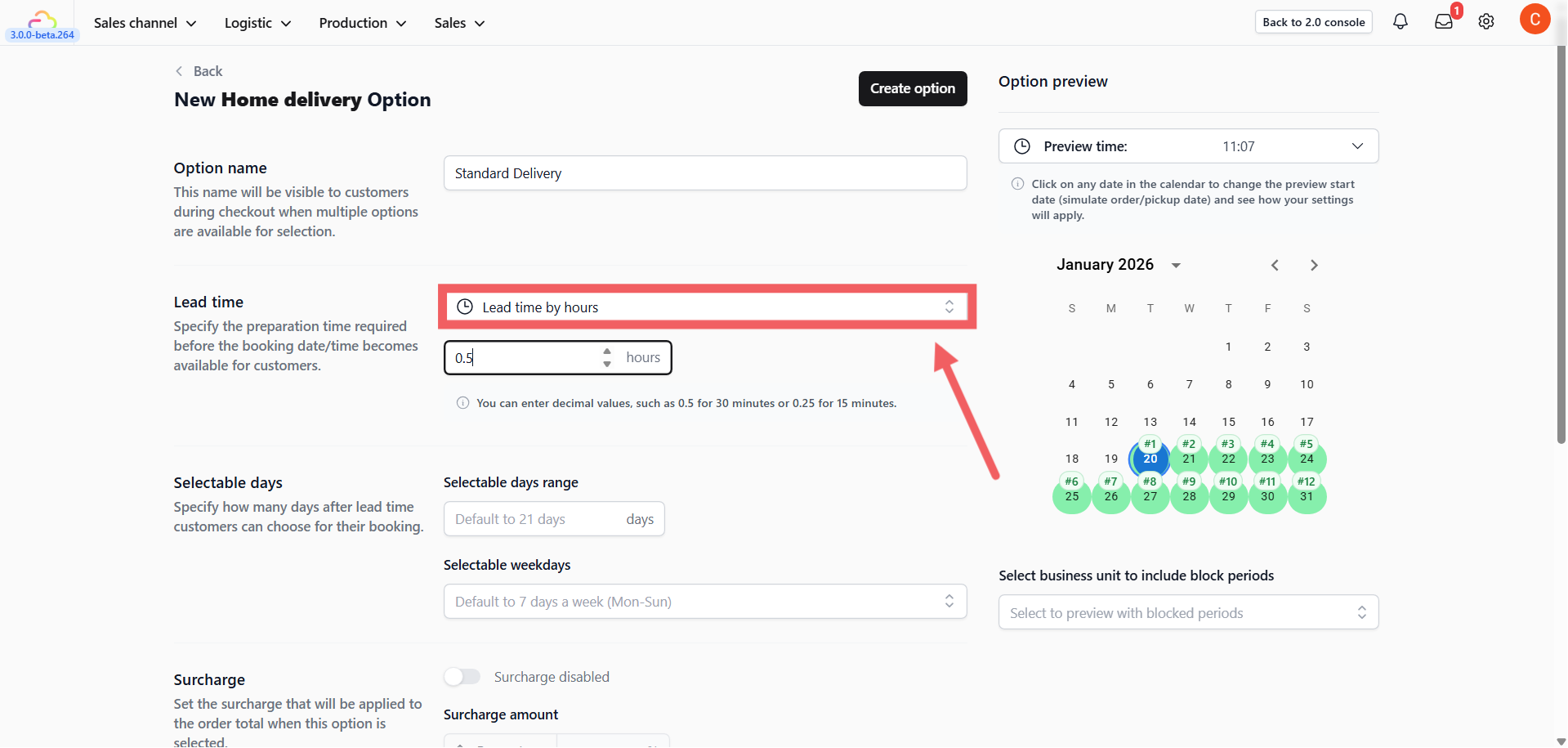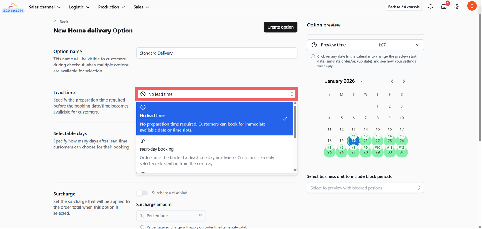 This determines the preparation buffer required before a slot becomes available. You can choose from 4 different types of lead time logic: