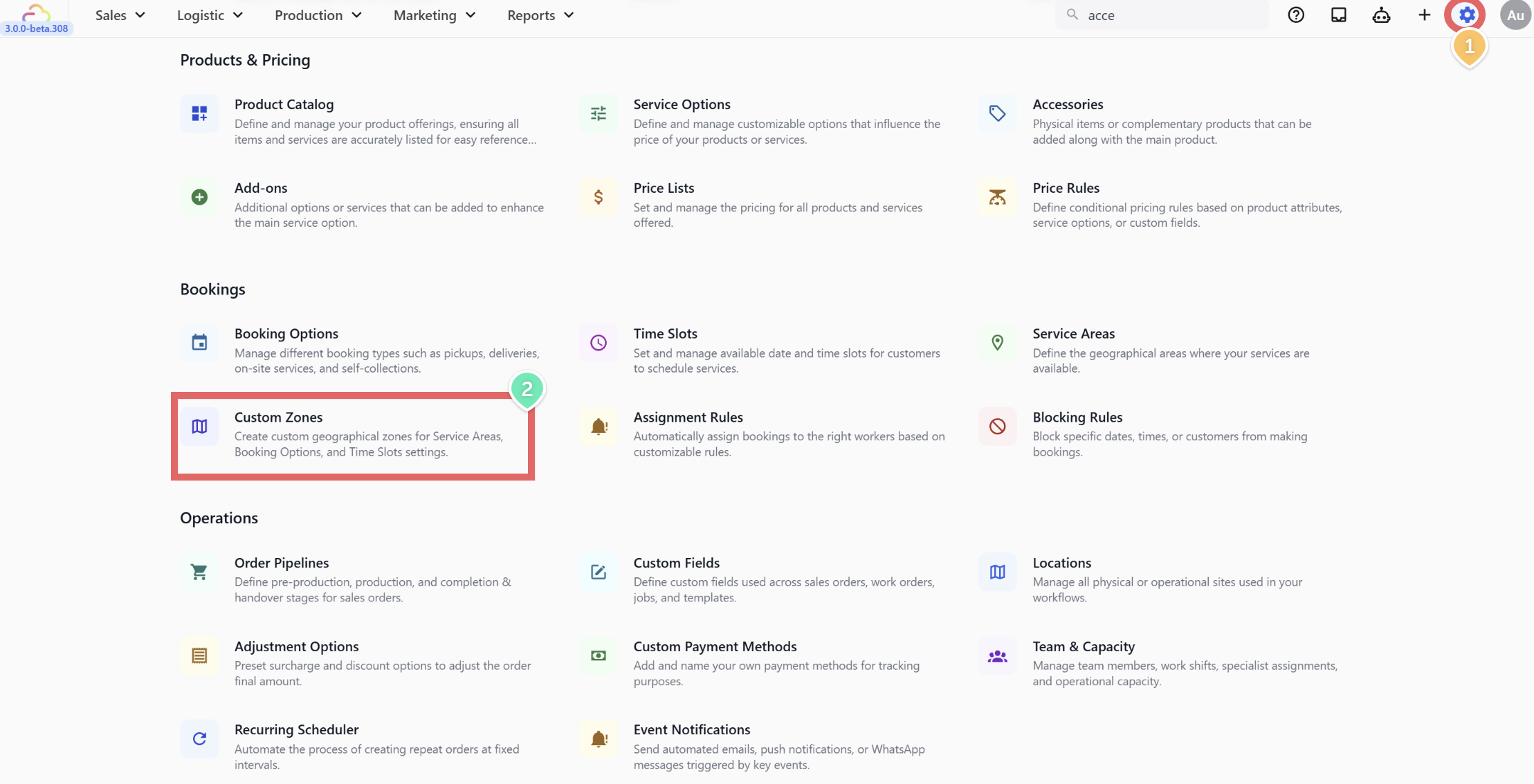 A Custom Zone is a named part of the map your business covers. Once zones exist, everything else in Bookings can reference them β service areas, time-slot limits, assignment rules, and per-zone minimum orders. Use this only if you want to limit or price differently by area.