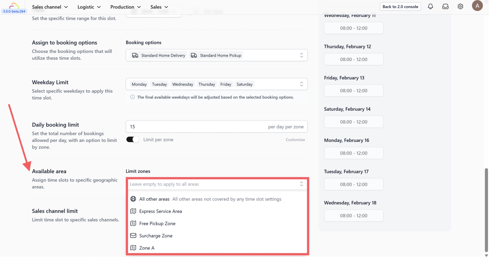 6. Available area: Assign this slot to specific geographic zones.