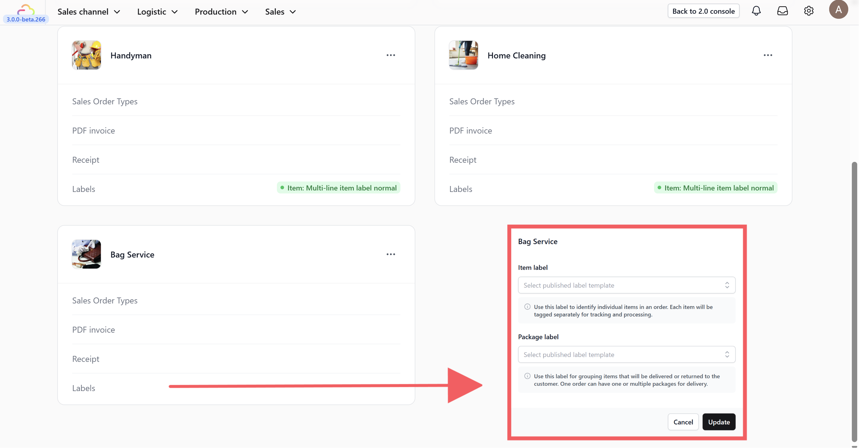 - Labels: Choose the template for items and packaging.