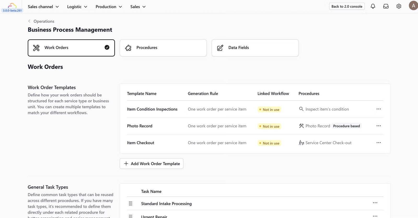 This feature allows you to define how your work orders should be structured for each service type or business unit, enabling you to create multiple templates to match different workflows. (A setup guide on how to use this feature is available on the Work Orders page).