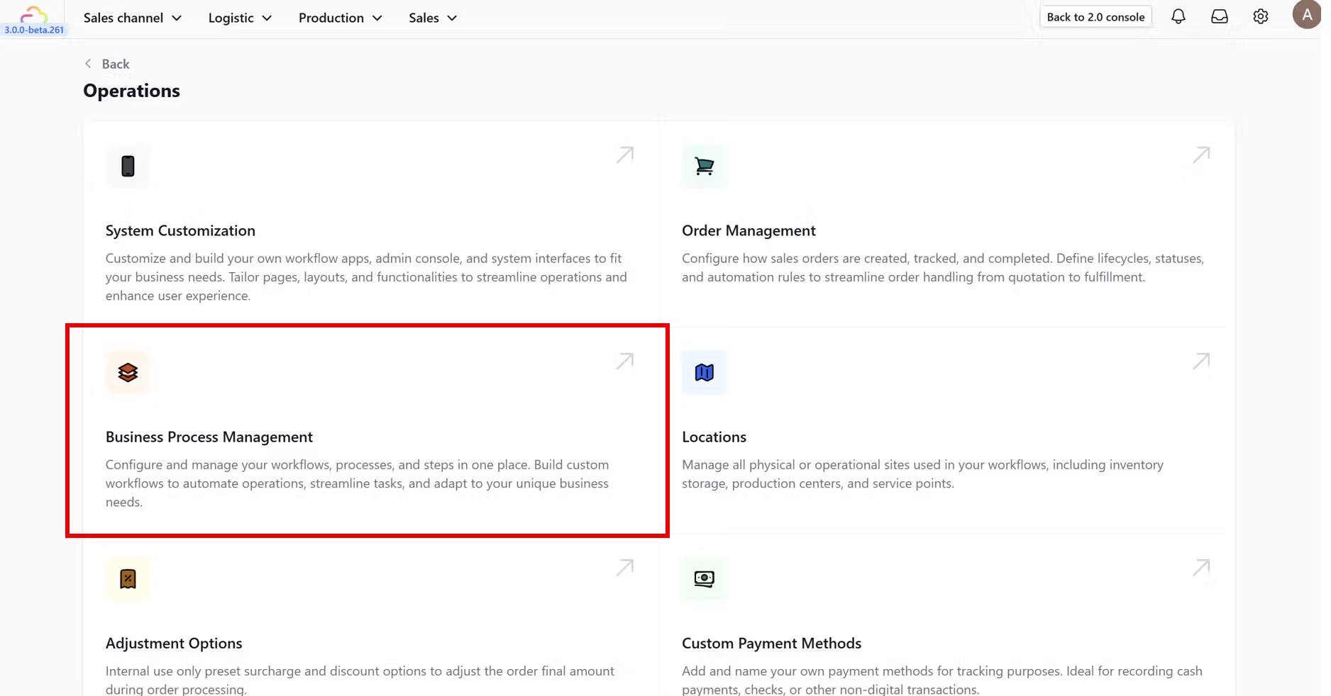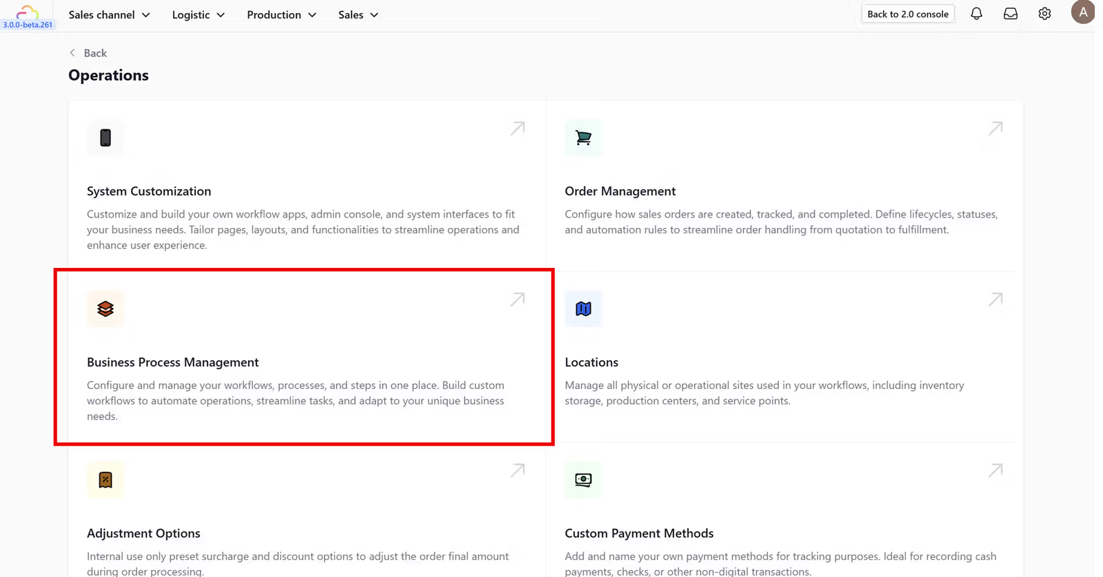 Within the Operations dashboard, find and click on the Business Process Management feature card.