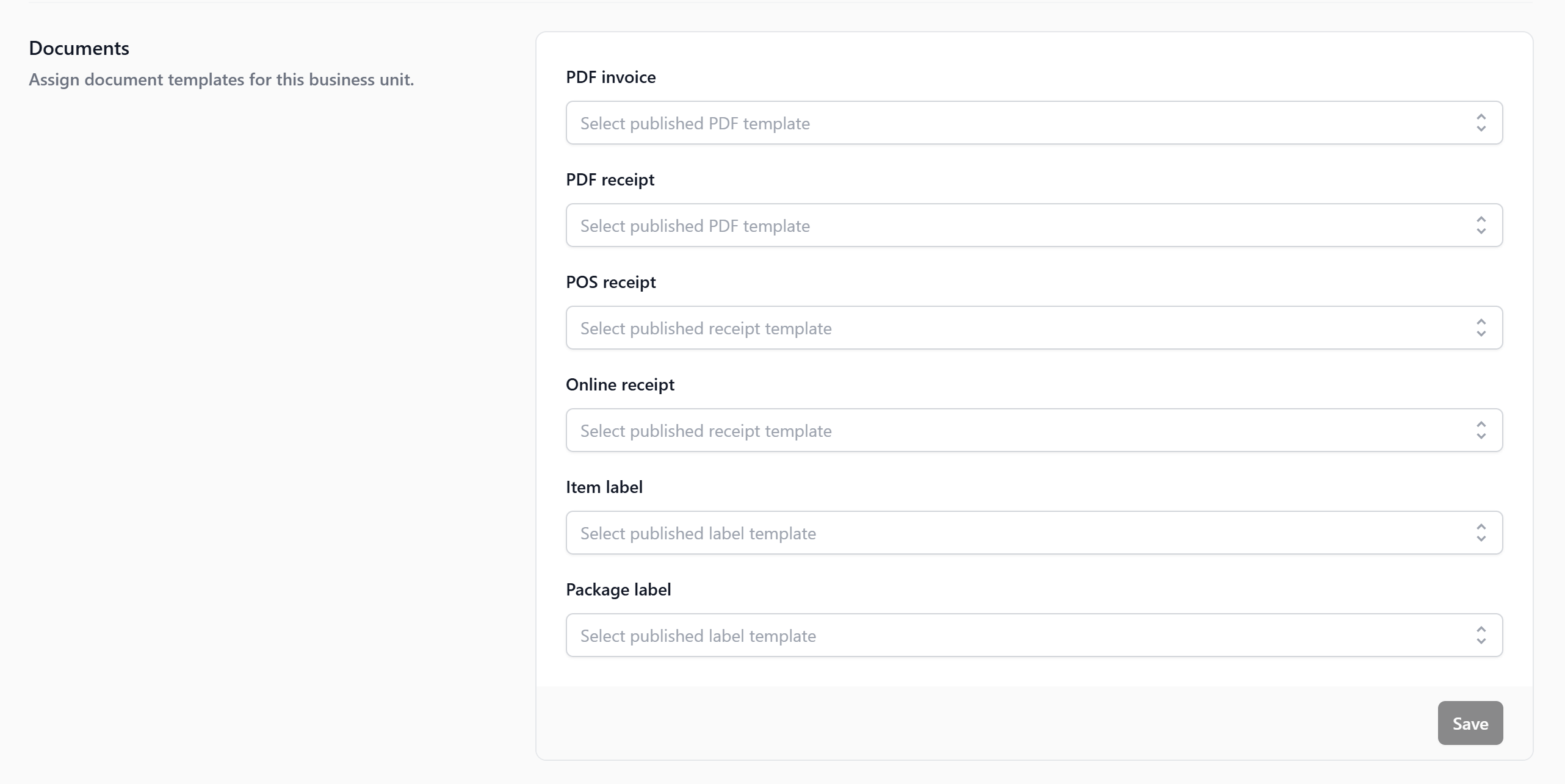 The Documents section is where you link your business unit to its print and digital templates β receipts, invoices, and item labels. Without this, orders can still be created, but no receipts or labels will be generated.