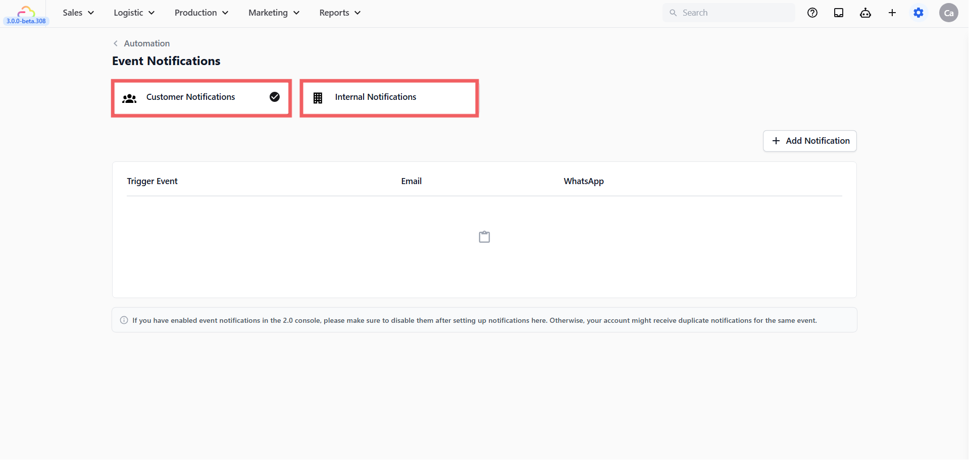 Event Notifications is split into two tabs so customer-facing and internal messages stay separate.