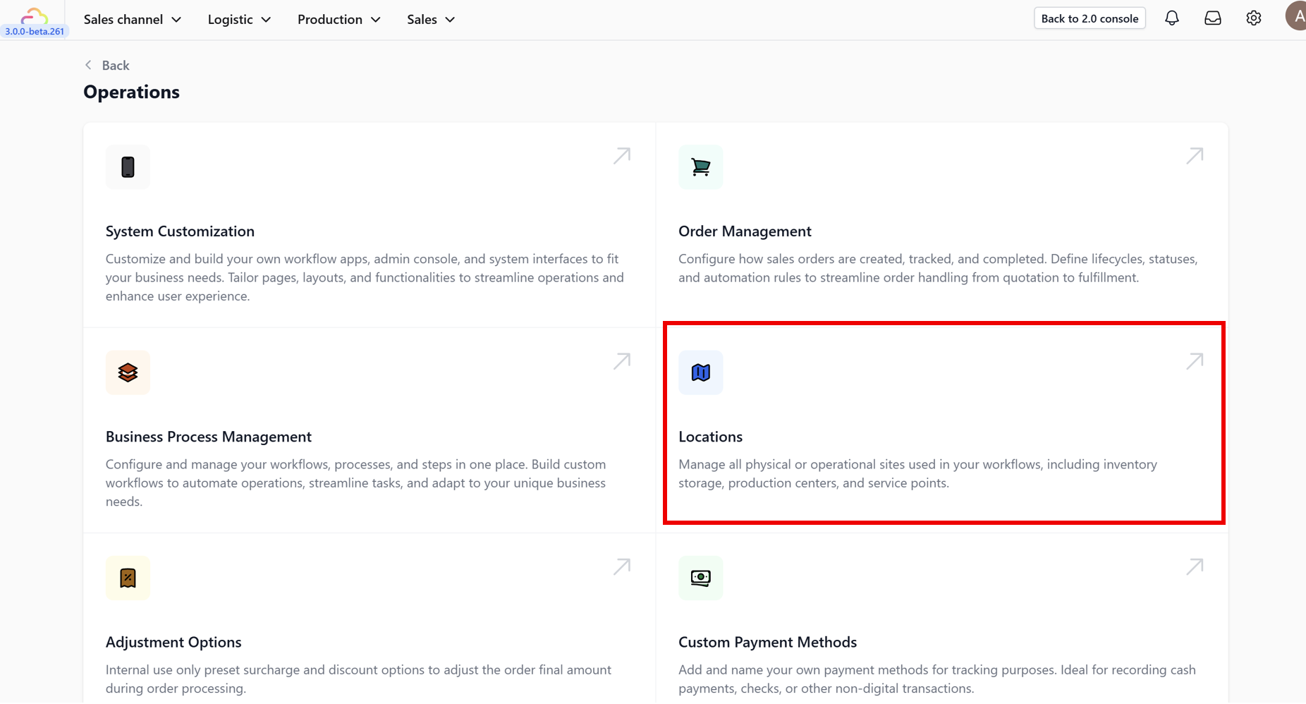 3. Within the Operations dashboard, find and click on the Locations feature card.
