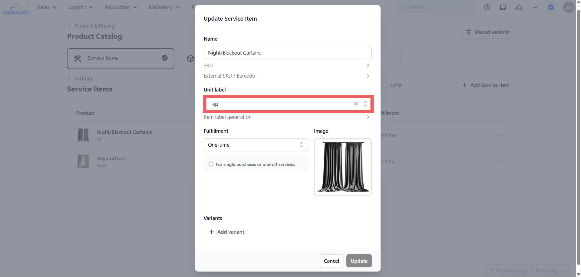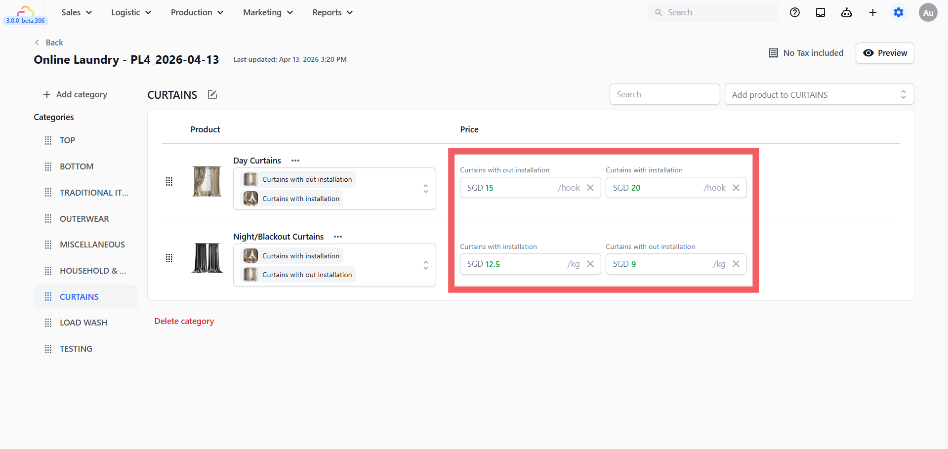Open your product catalog and find the items you want this flow to apply to. For example Curtain, Carpet, or Bulk Wash. Make sure each one has the correct unit set, such as kg, sqft, ft, inch, or hook. This is what tells the system which items should trigger the flow. See [Setting Up Your Product Catalog].