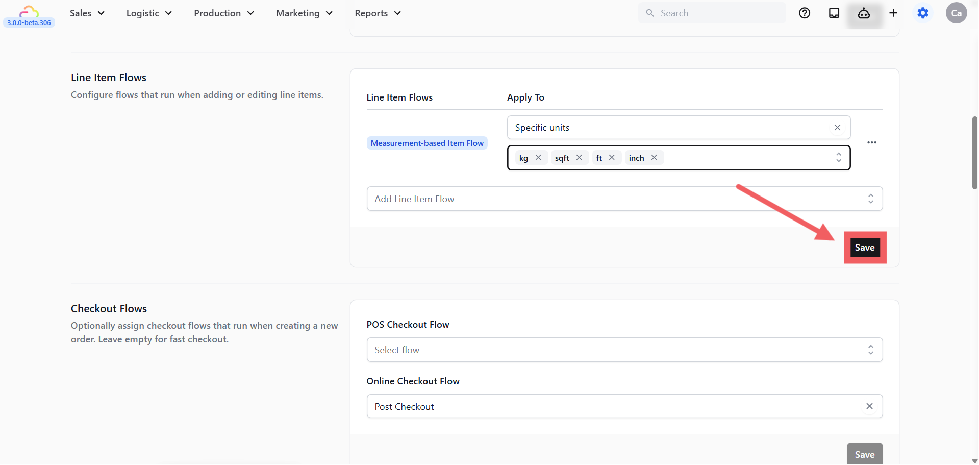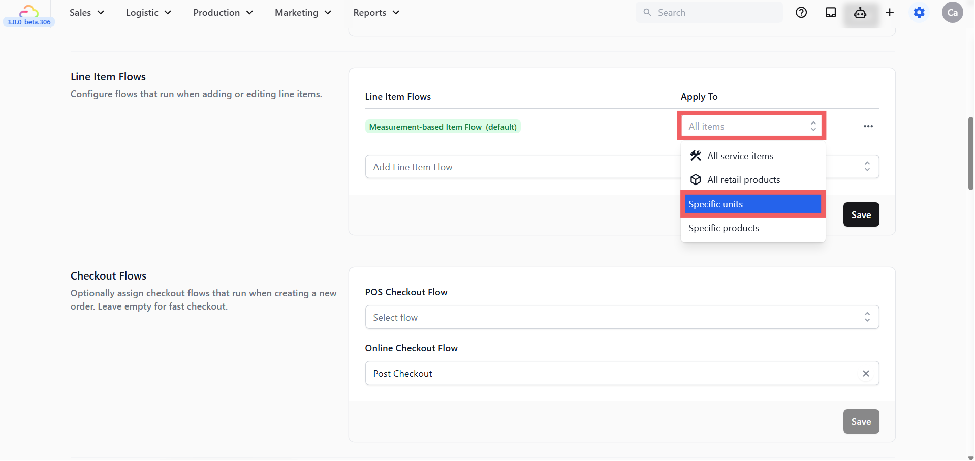 - Open your Laundry Business Unit and Scroll to the Line Item Flows section
