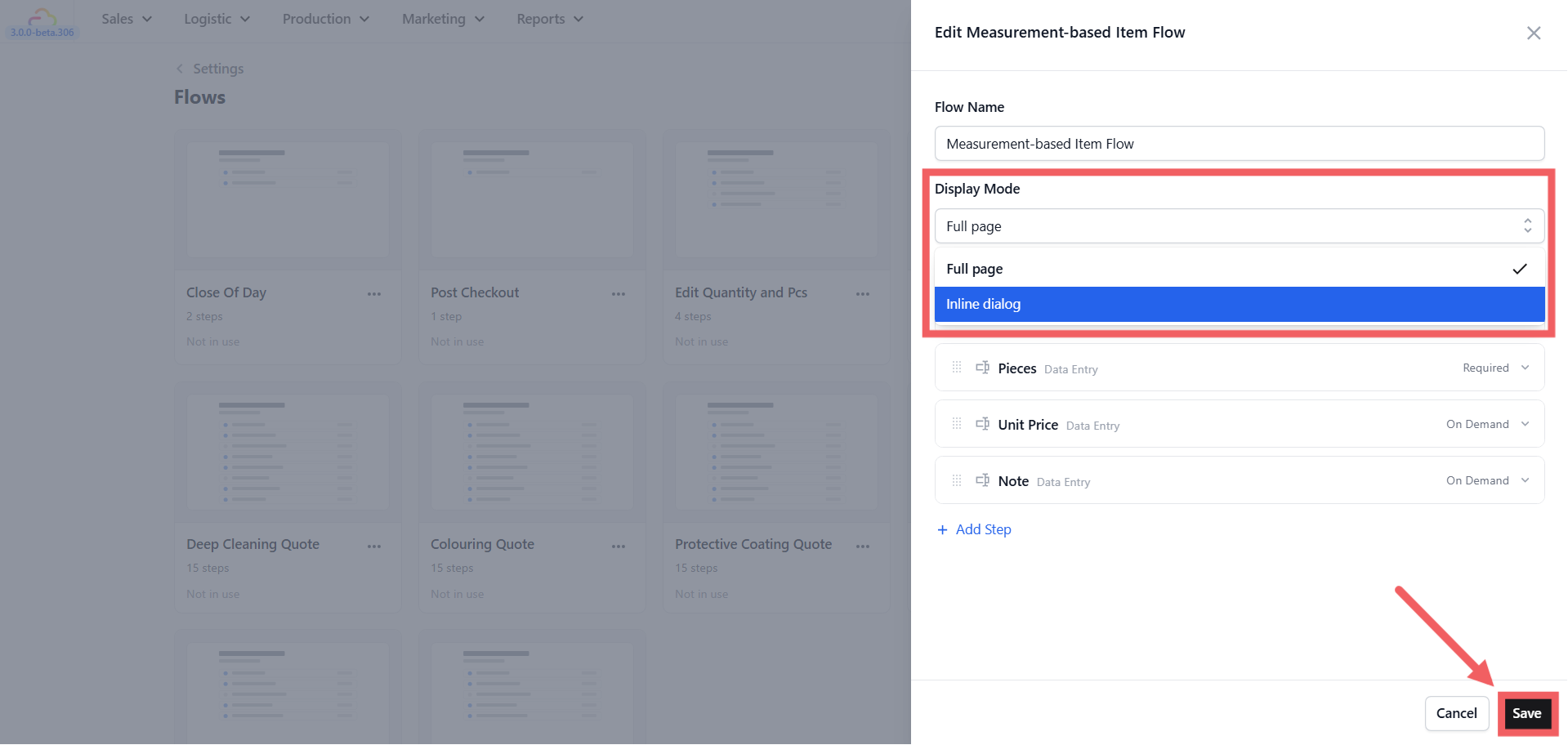 After saving, reopen the flow and check the Display Mode setting. It defaults to Full page. If you want the form to appear directly below the cart item instead of opening a separate screen, change it to Inline dialog and save again.
