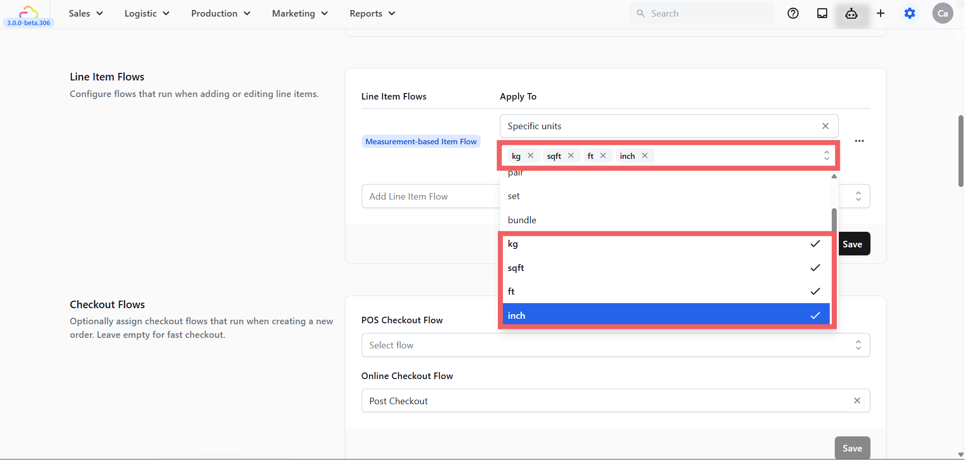 | Specific units | Only items with specific unit labels trigger this flow (e.g. sqft, kg, hook) |