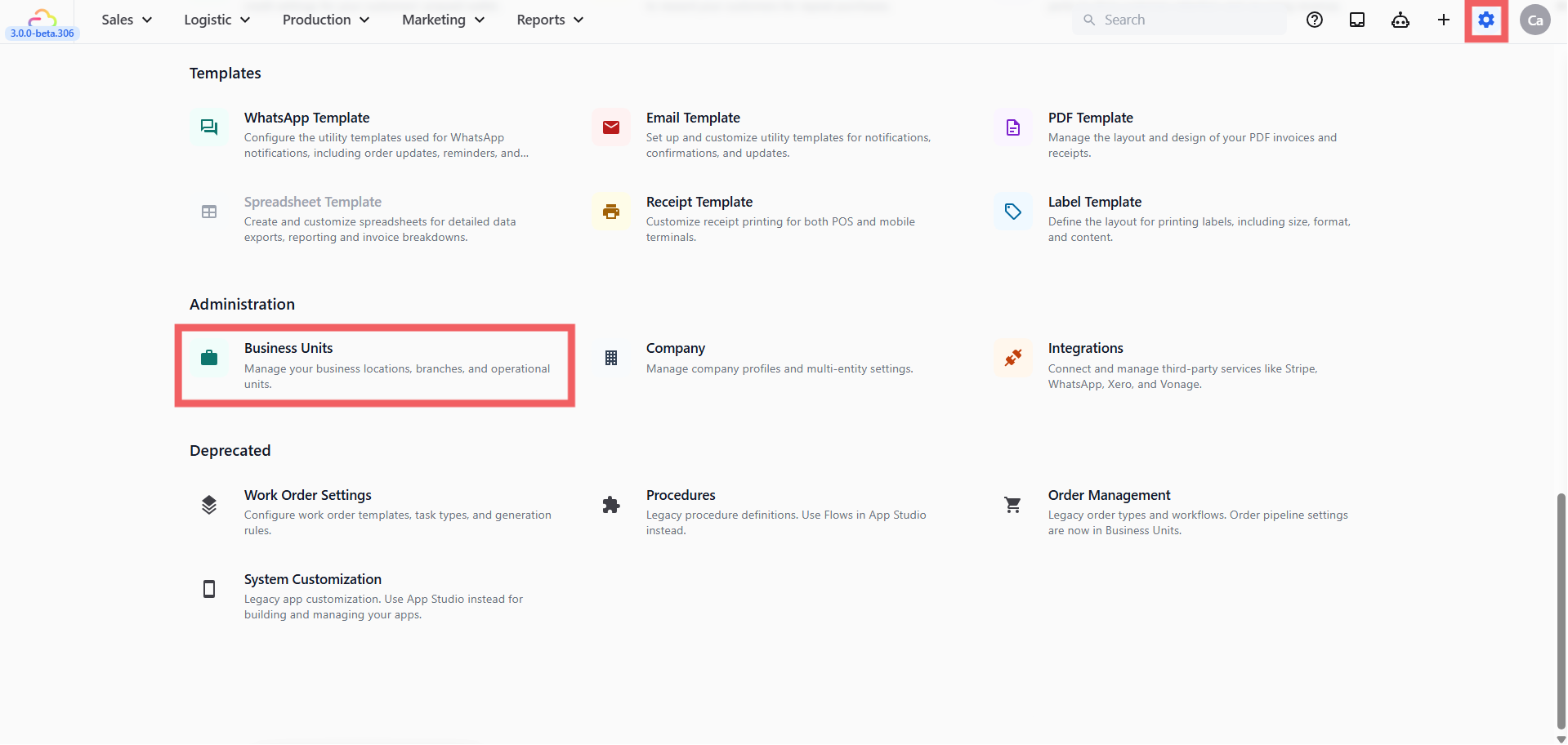 - Scroll down to Administration section and click Business Units