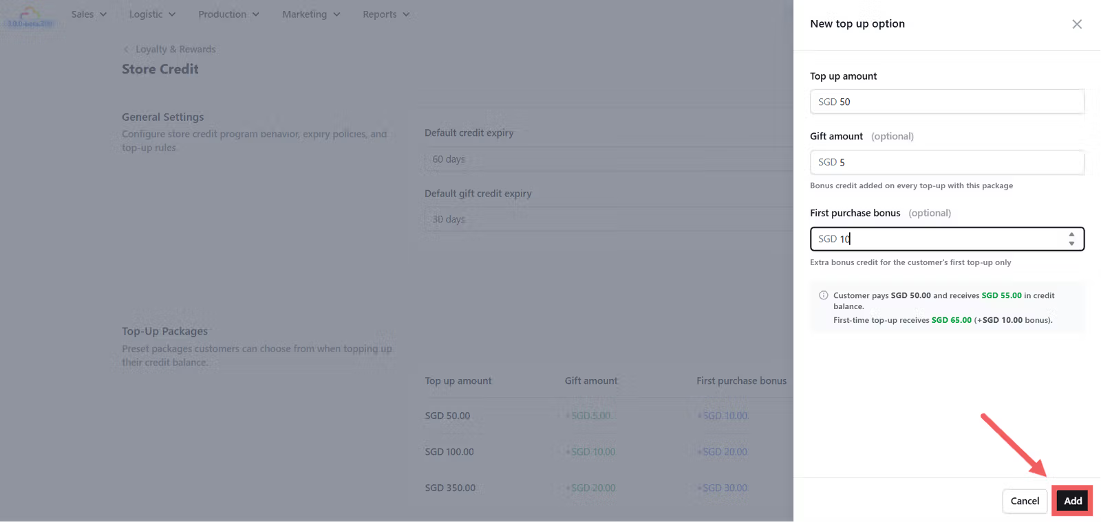 Click + Add top-up option to open the new package dialog.