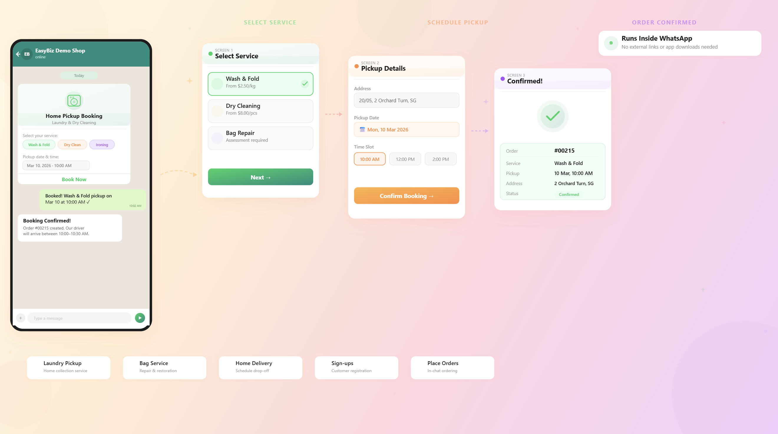 Set up a Home Pickup Booking Flow for your Laundry business so your customers can book directly inside WhatsApp.