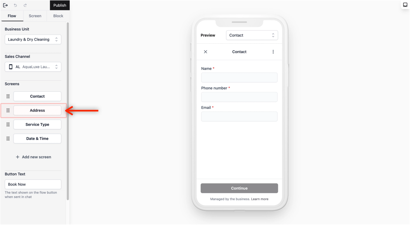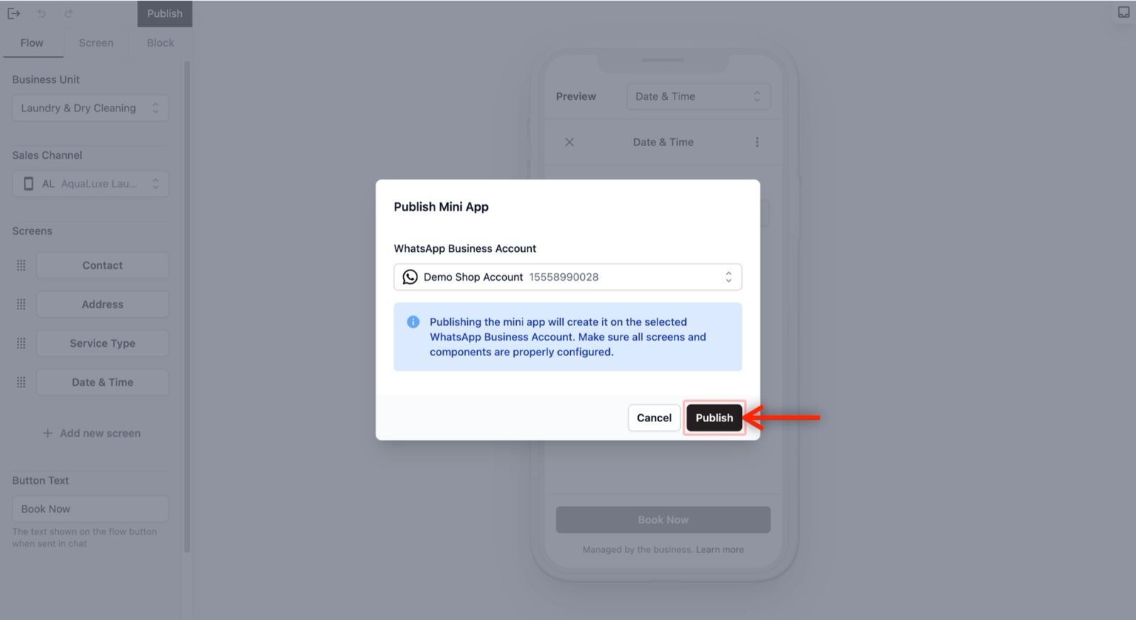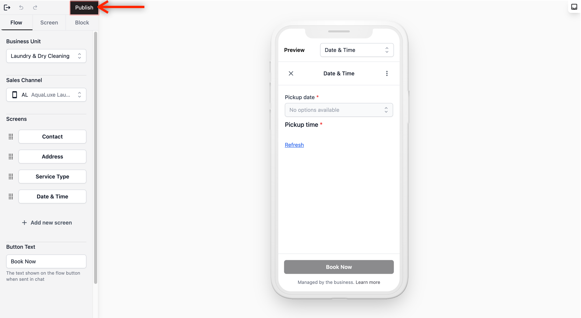 Once you are happy with how your laundry booking form looks in the preview, you need to Publish it. This makes the form live so your customers can actually start booking their laundry pickups on WhatsApp.