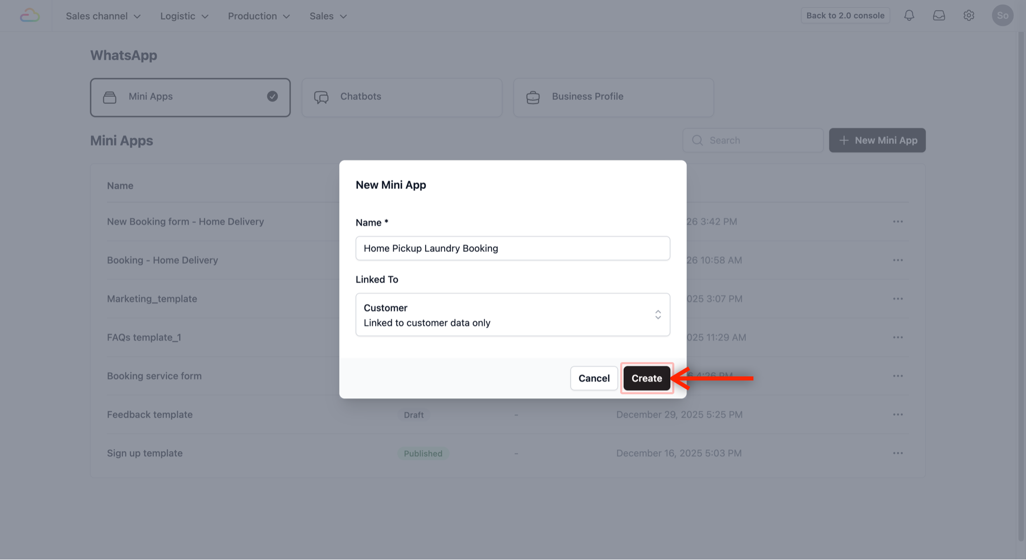 What does this mean? Your Mini App is now officially live. Customers can start booking their laundry pickups through WhatsApp, and every booking will flow directly into your Sales Orders dashboard, complete with their name, address, service type, and preferred pickup time.