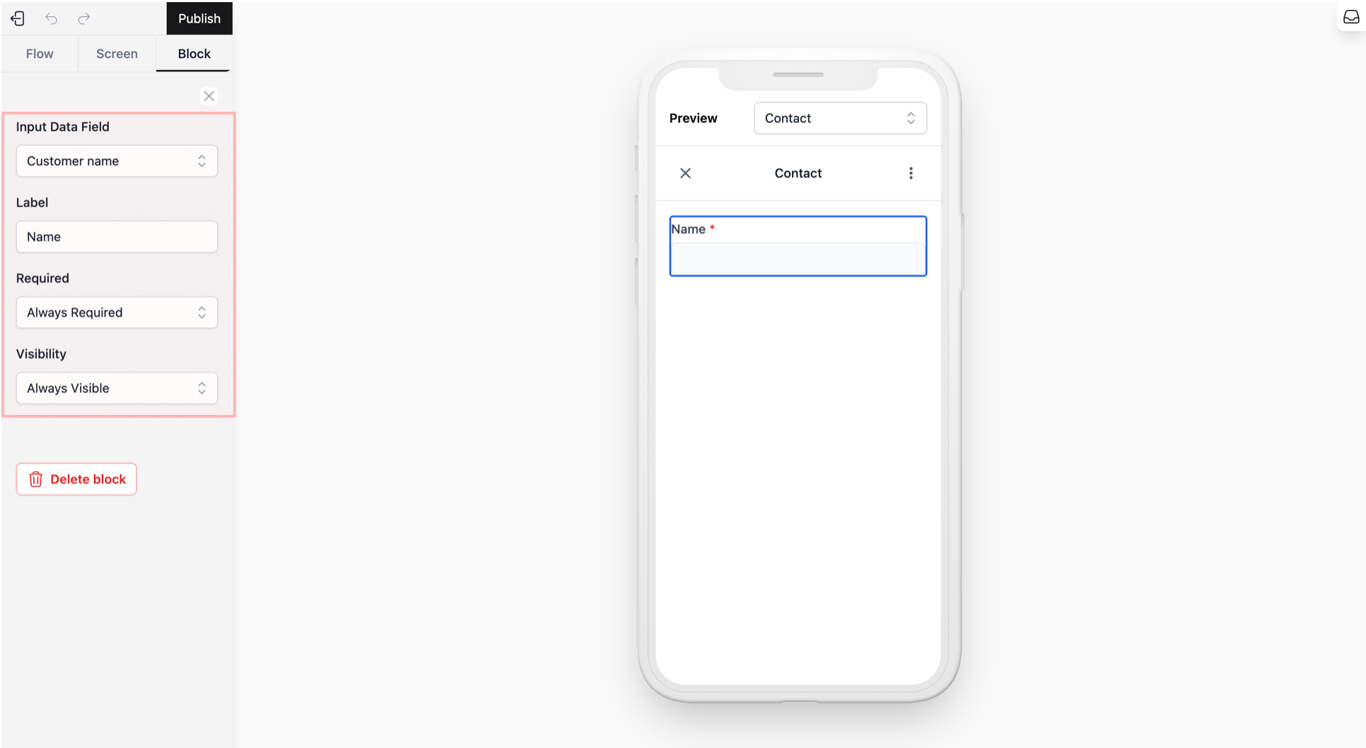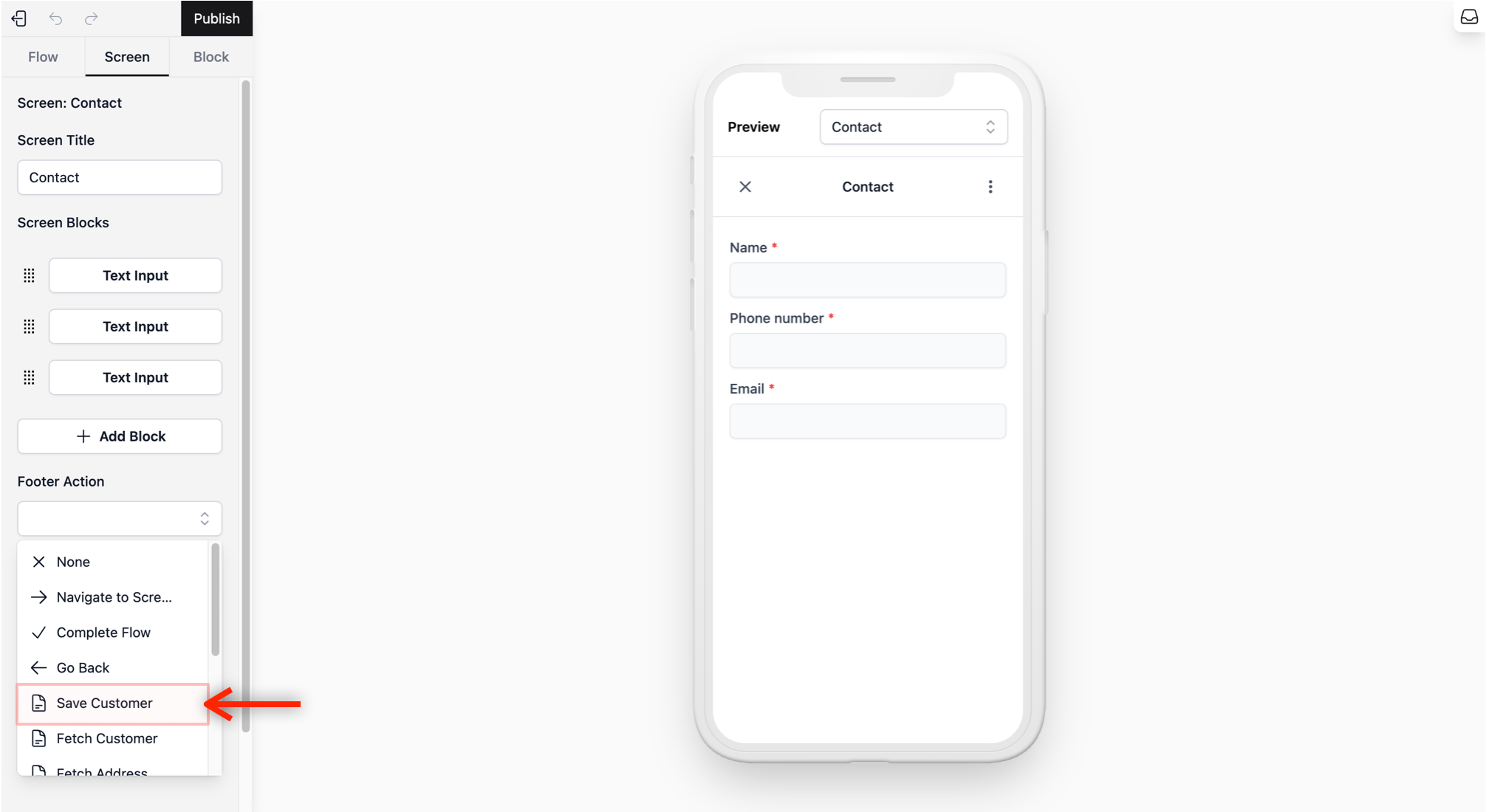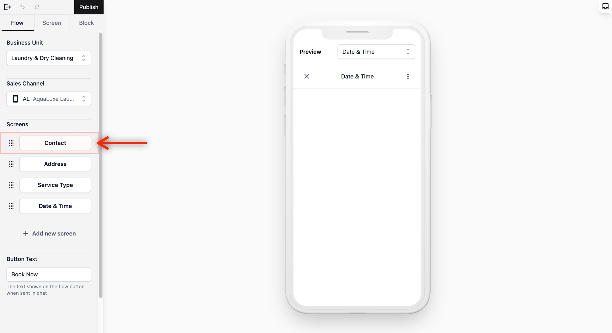 • From the Flow Tab, click on the Contact Screen to start adding the contact information fields required.