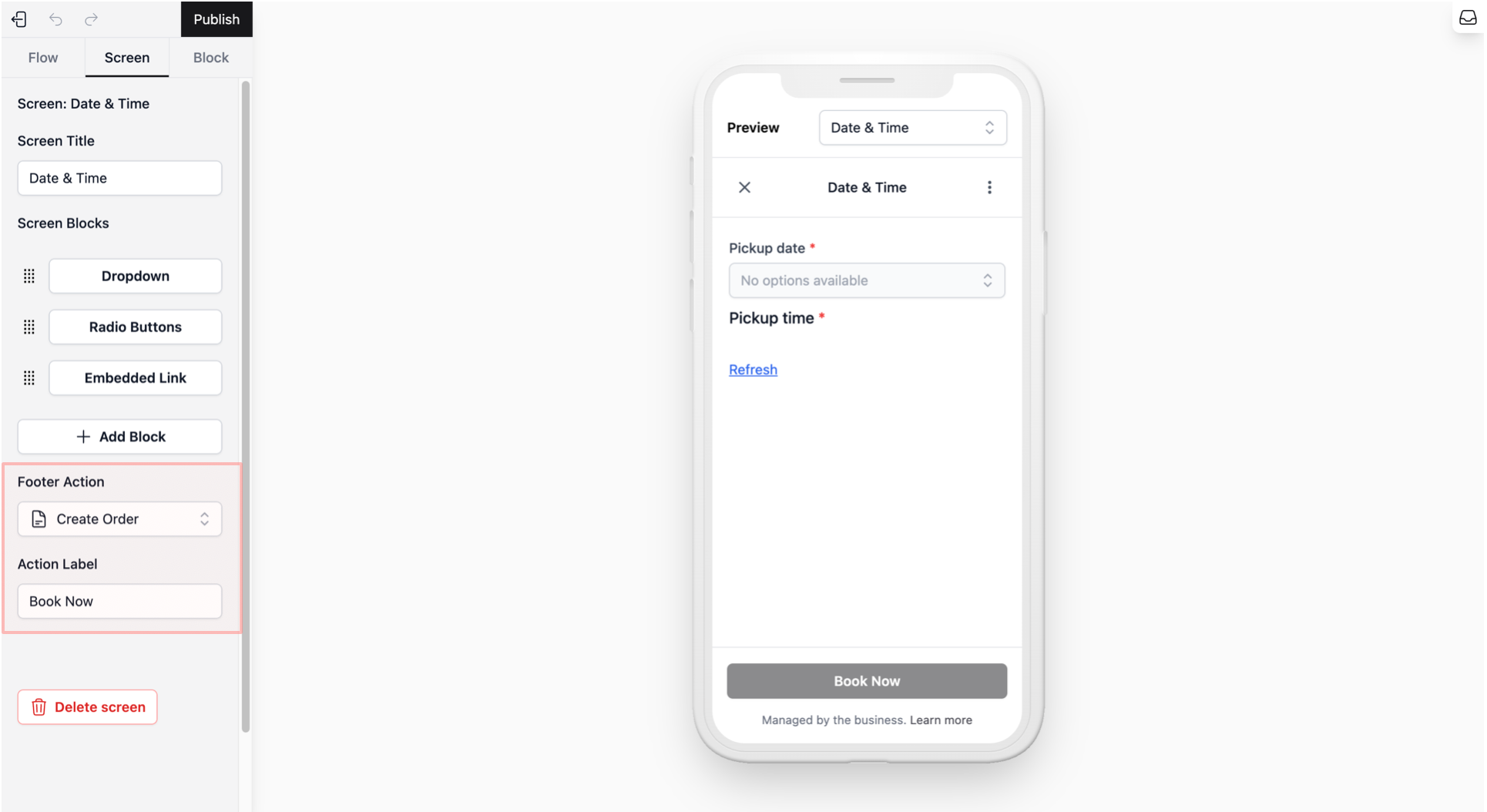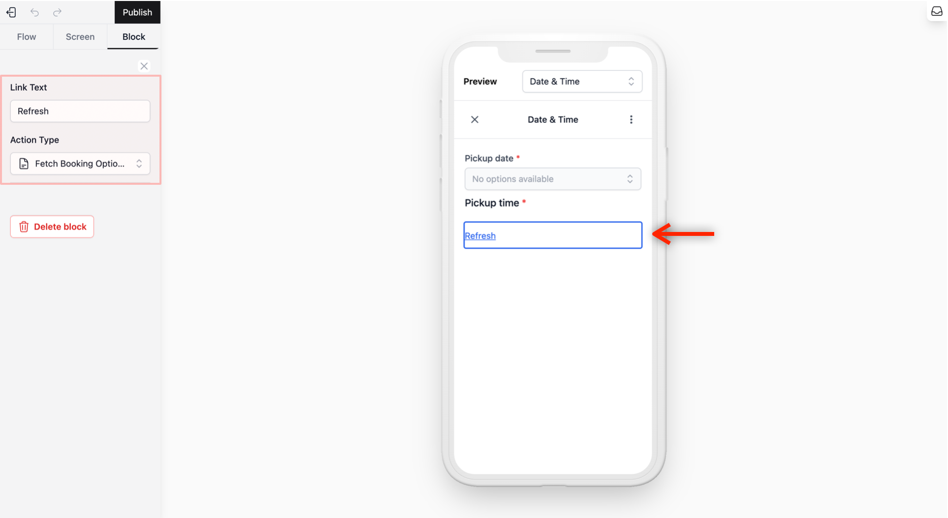 • Link Text: Name this "Refresh" or any name that tells the customer this will update the available dates and times when they tap it.