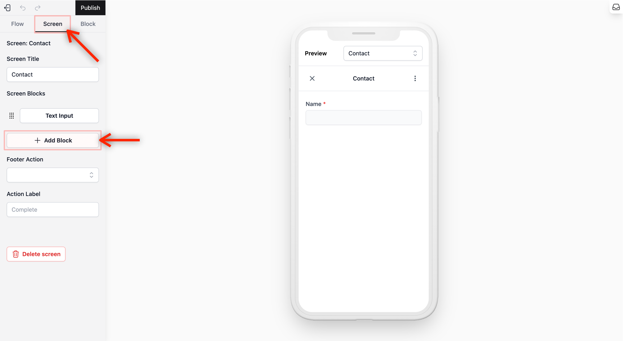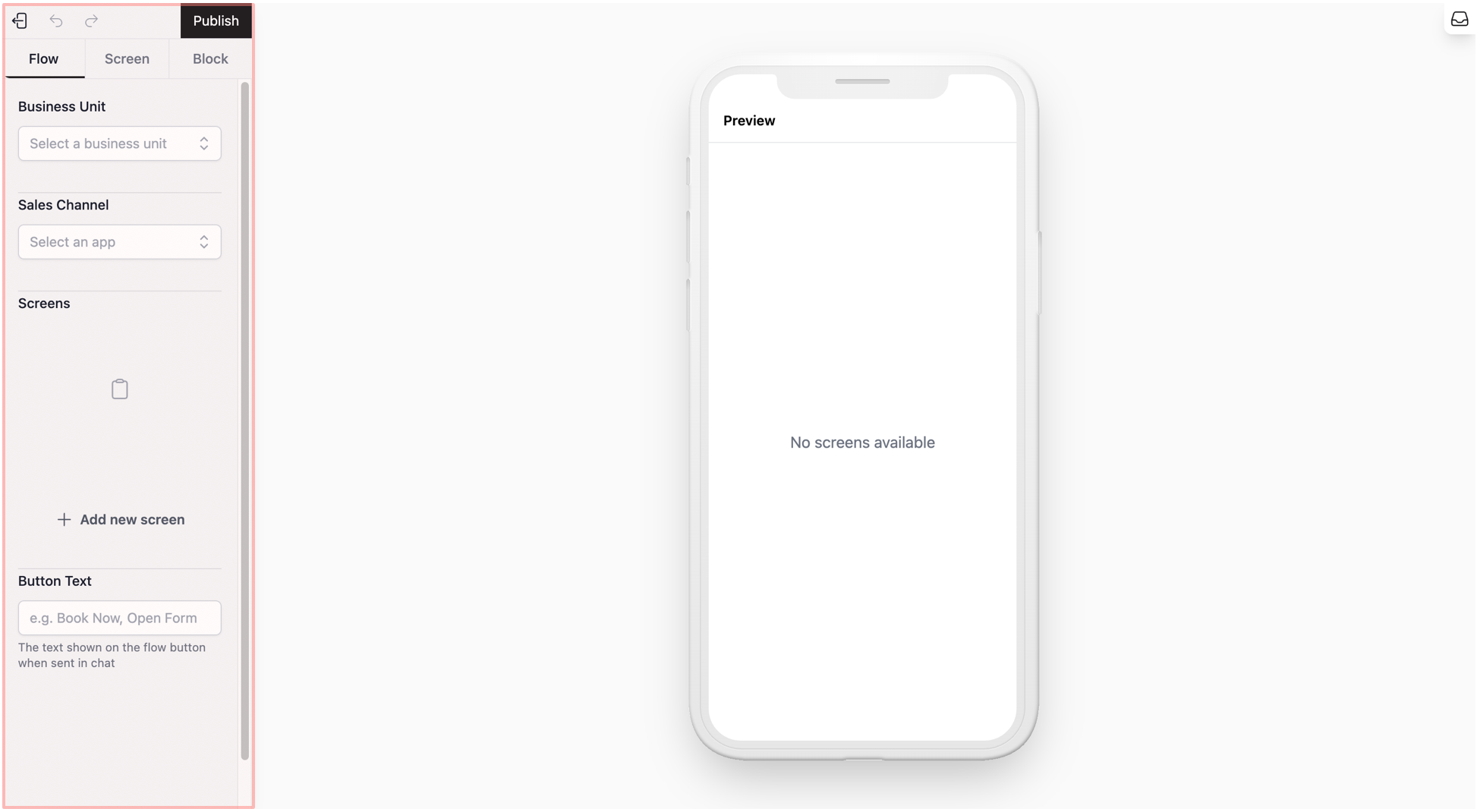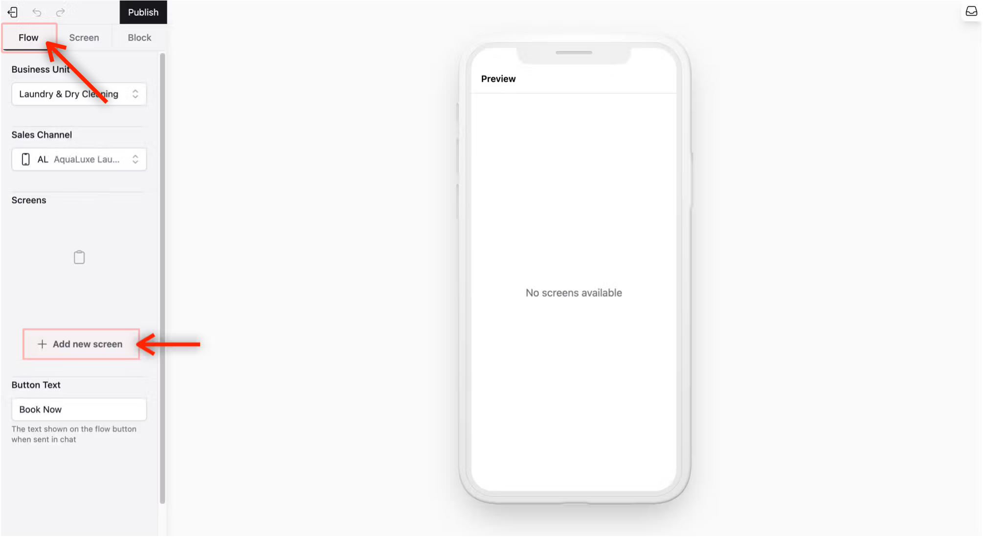 • To make a new screen, click on the Flow Tab and click the + Add New Screen button.
