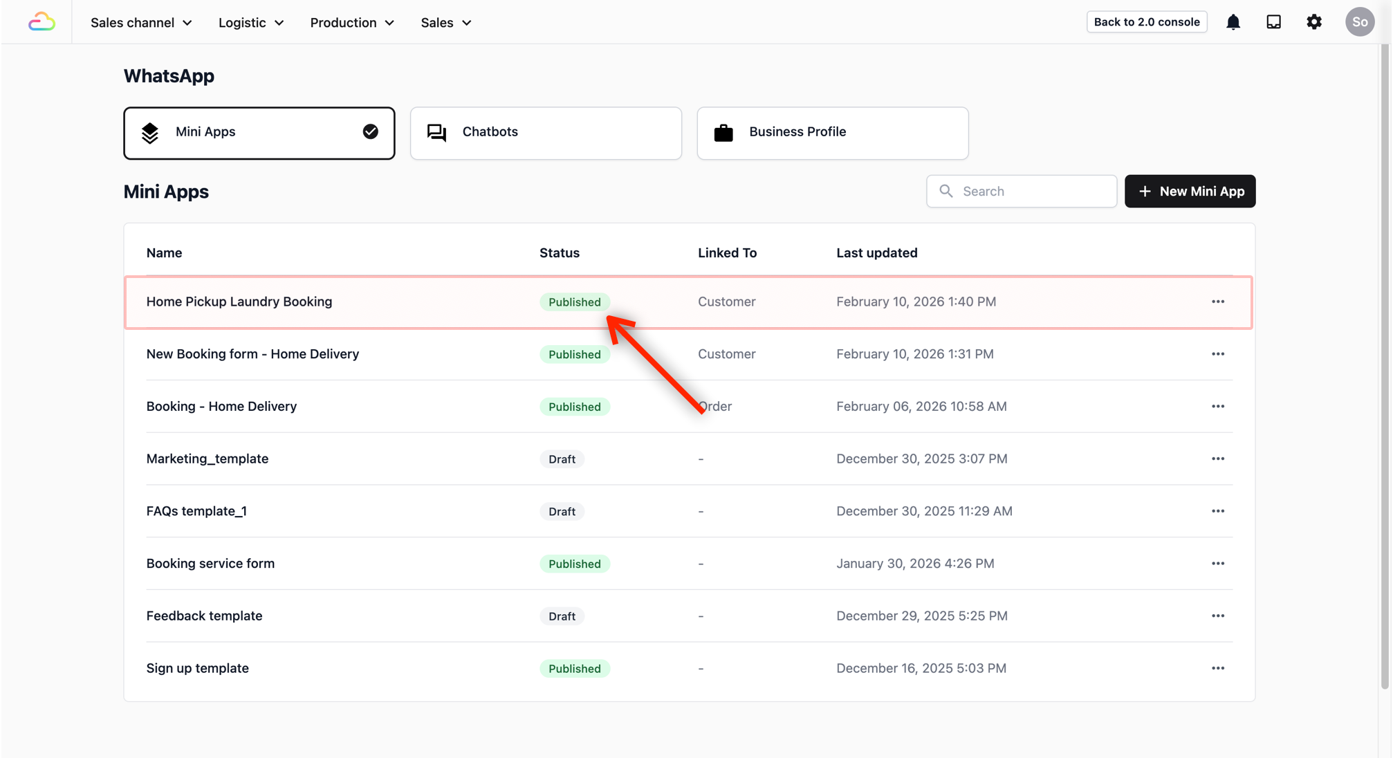 • Look for your Mini App in the list. You should now see a status that says Published.
