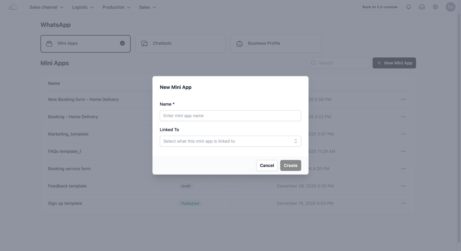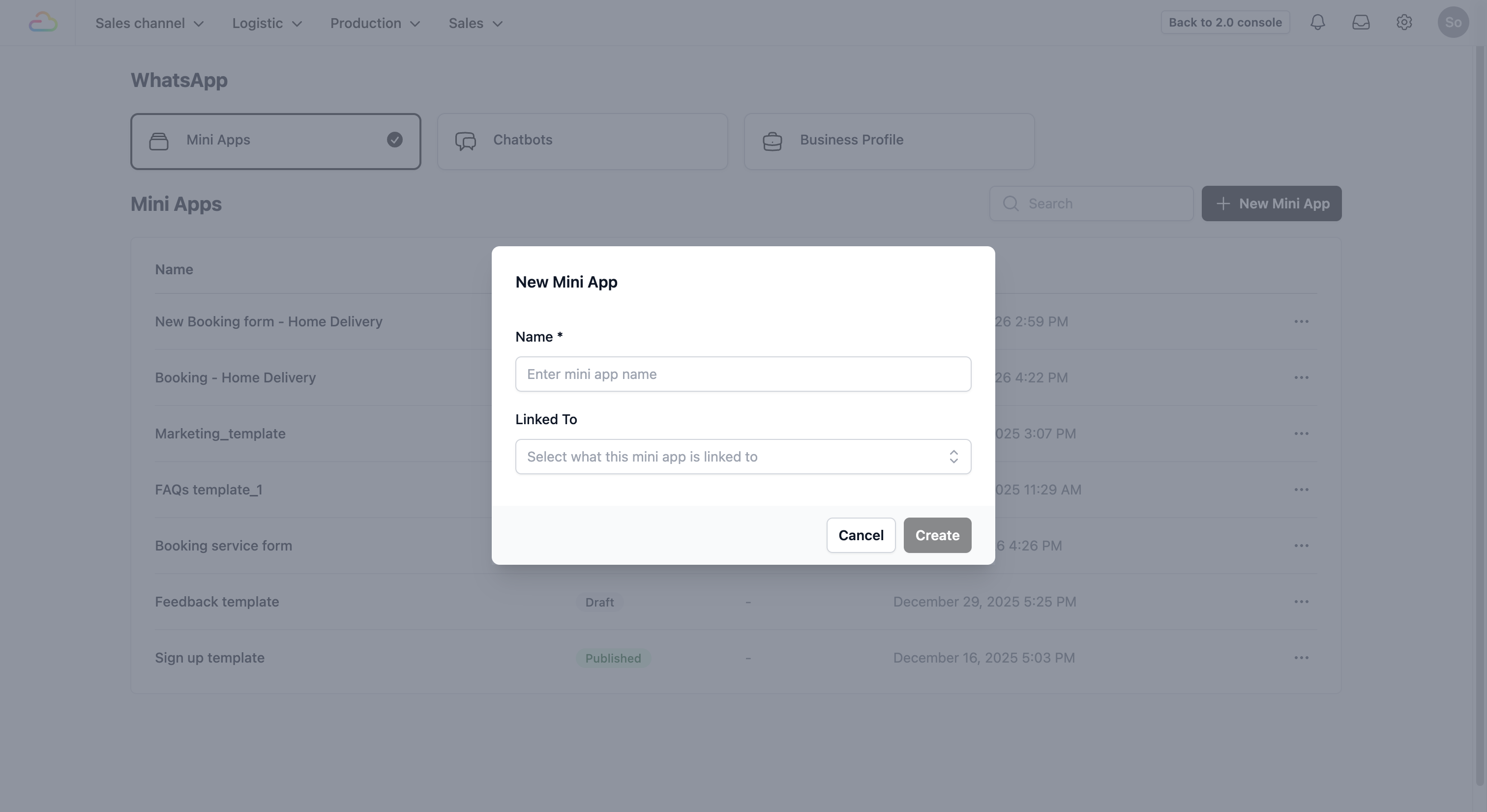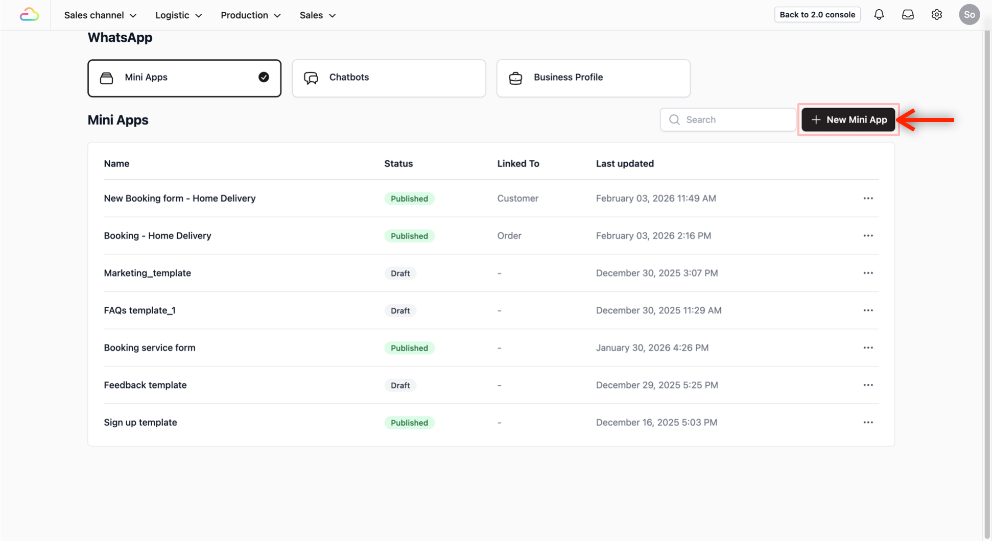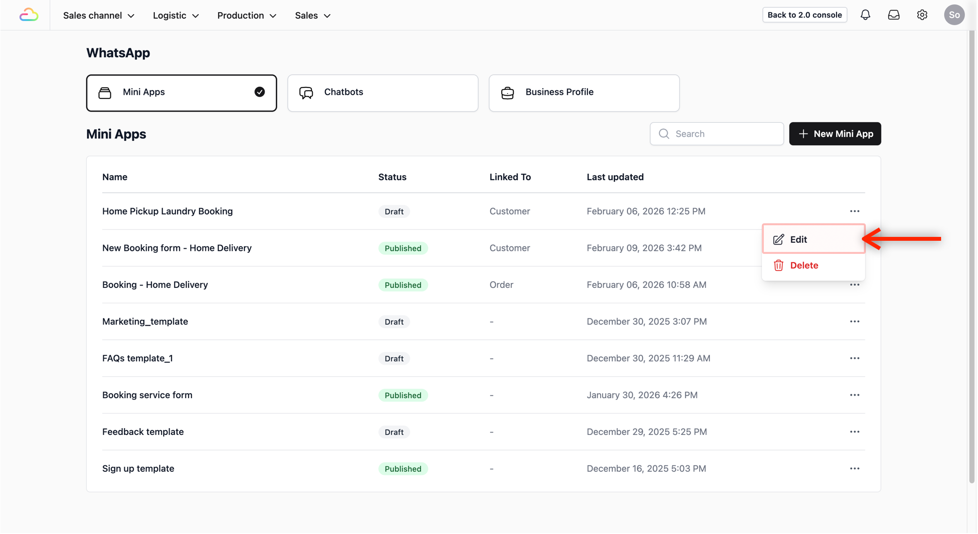 Tip: How to get back to your Mini App If you left the editor to create your data fields? You can return by clicking Sales Channel on the top navigation bar, and select WhatsApp. Click the three dots (•••) on the right of your app to select Edit.