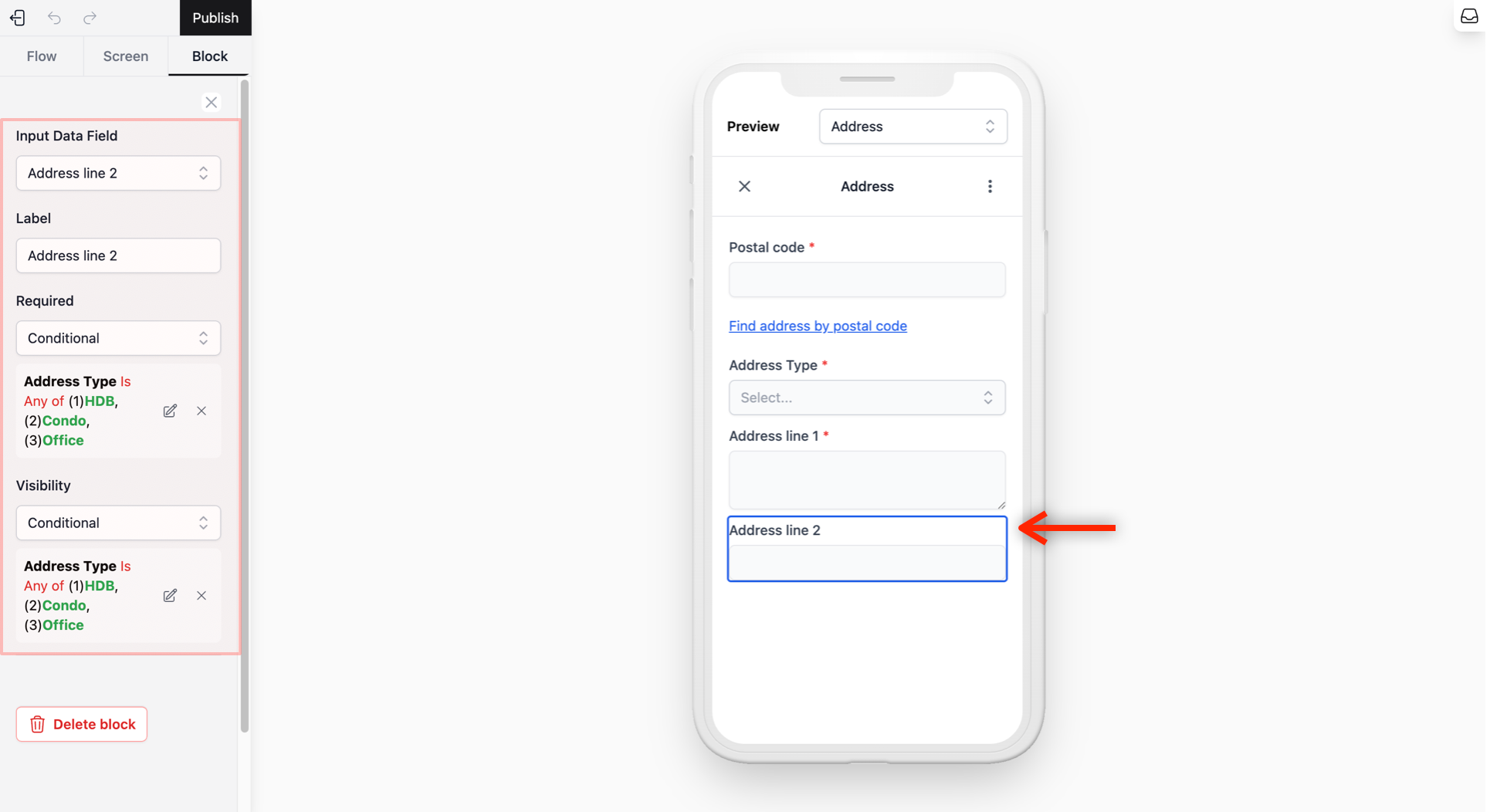 • Required & Visibility: To filter this based on the address type we set up earlier, set both to Conditional. From the pop-up window, set When to Address Type, Operator to Is Any Of, and Value to HDB, Condo, and Office. (This hides the field for "Landed" selections since landed houses typically don't have unit numbers). Click OK when done.