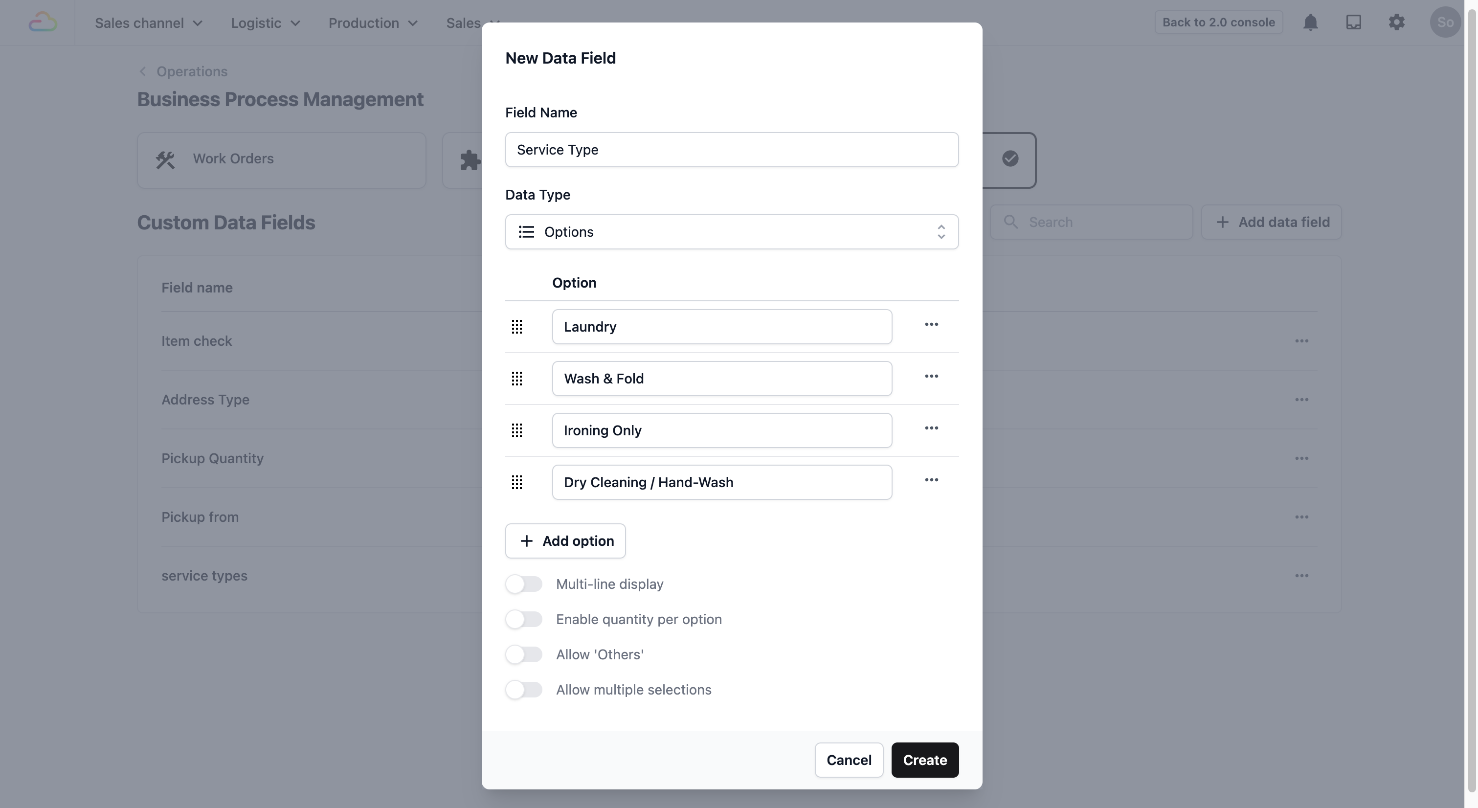 • Just like you did for the Address Type, go to Configuring Data Fields to create a new data field. Create a new data field called "Service Type" and choose Options as the Data Type. Add your service offerings, such as: