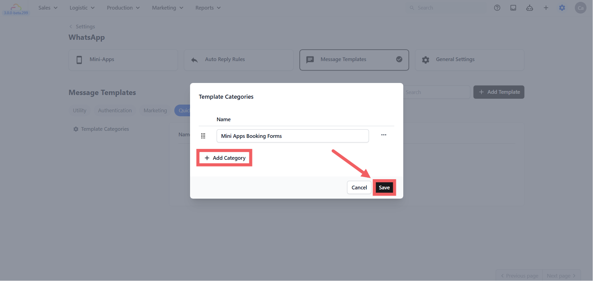 - Click + Add Category, enter a name (e.g., "Mini Apps Booking Forms"), and click Save