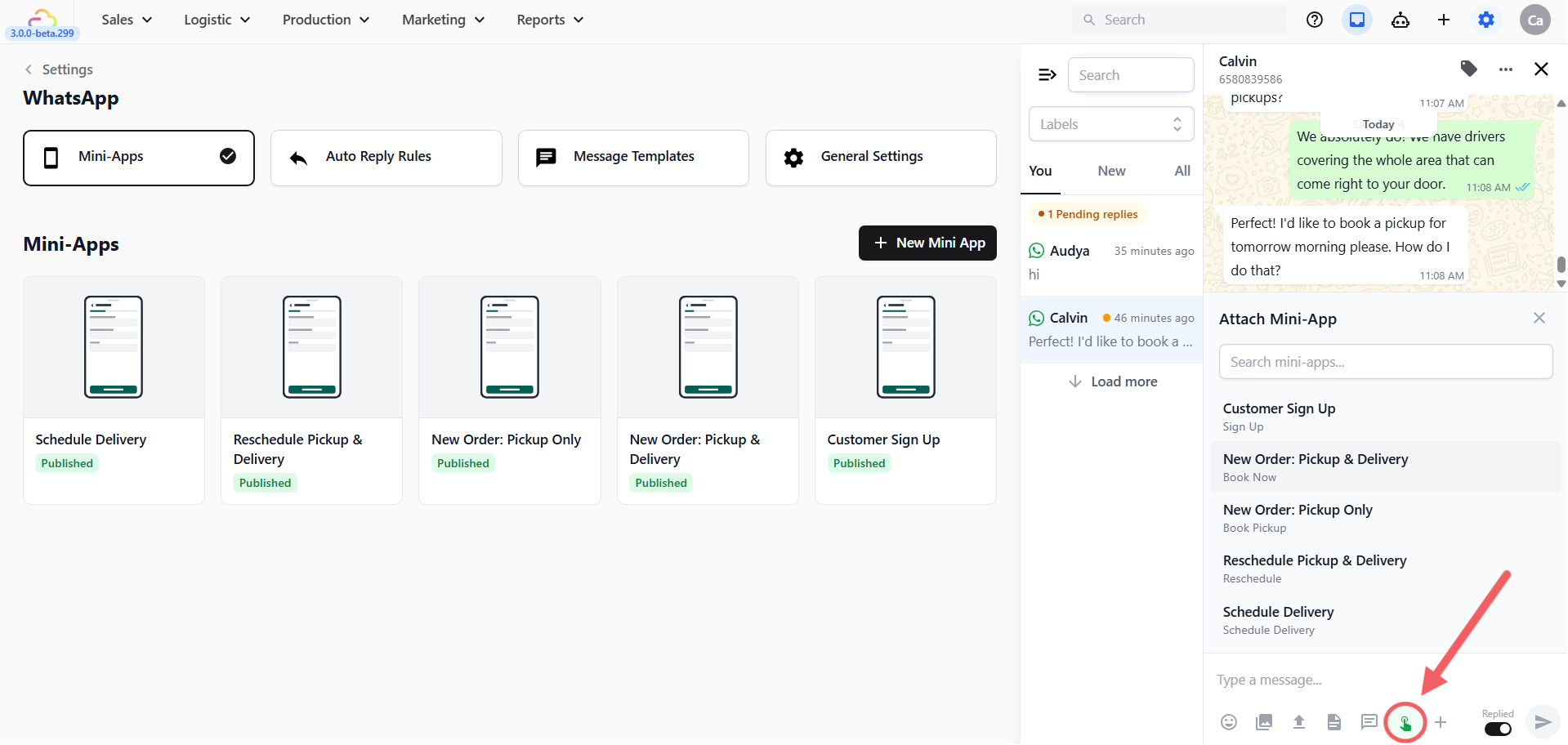 This is the simplest way to send a Mini App while you are having a conversation with a customer.