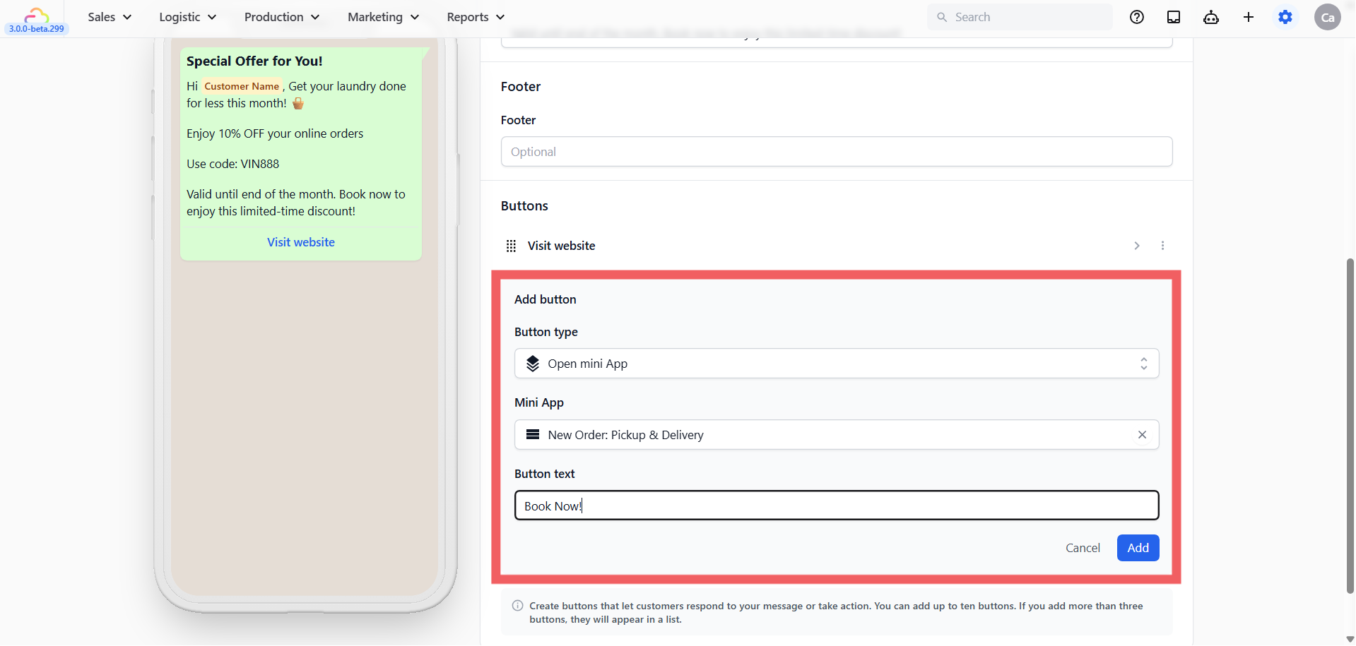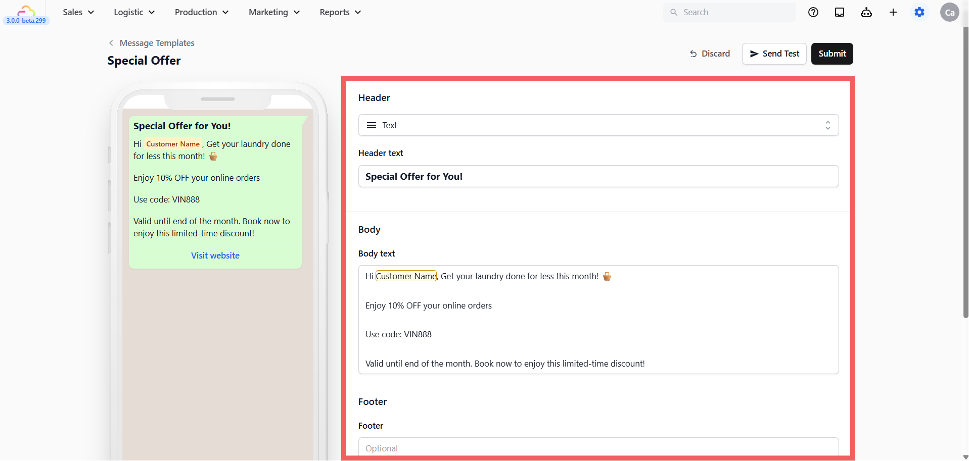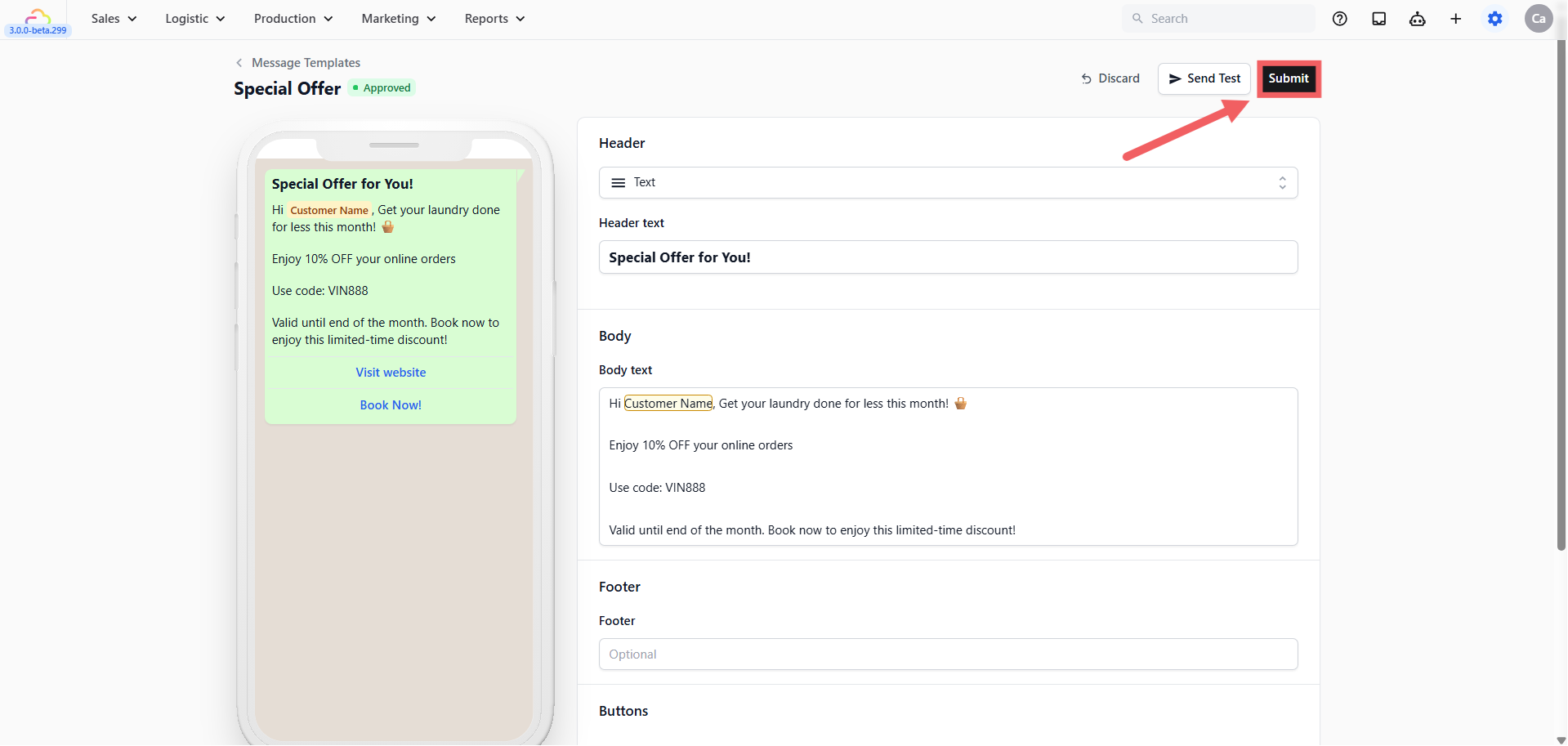 - Edit your message in the Body (e.g., "Hi @Customer Name, get 10% off laundry this month! Book below."). You can also edit the Header or add a Footer note