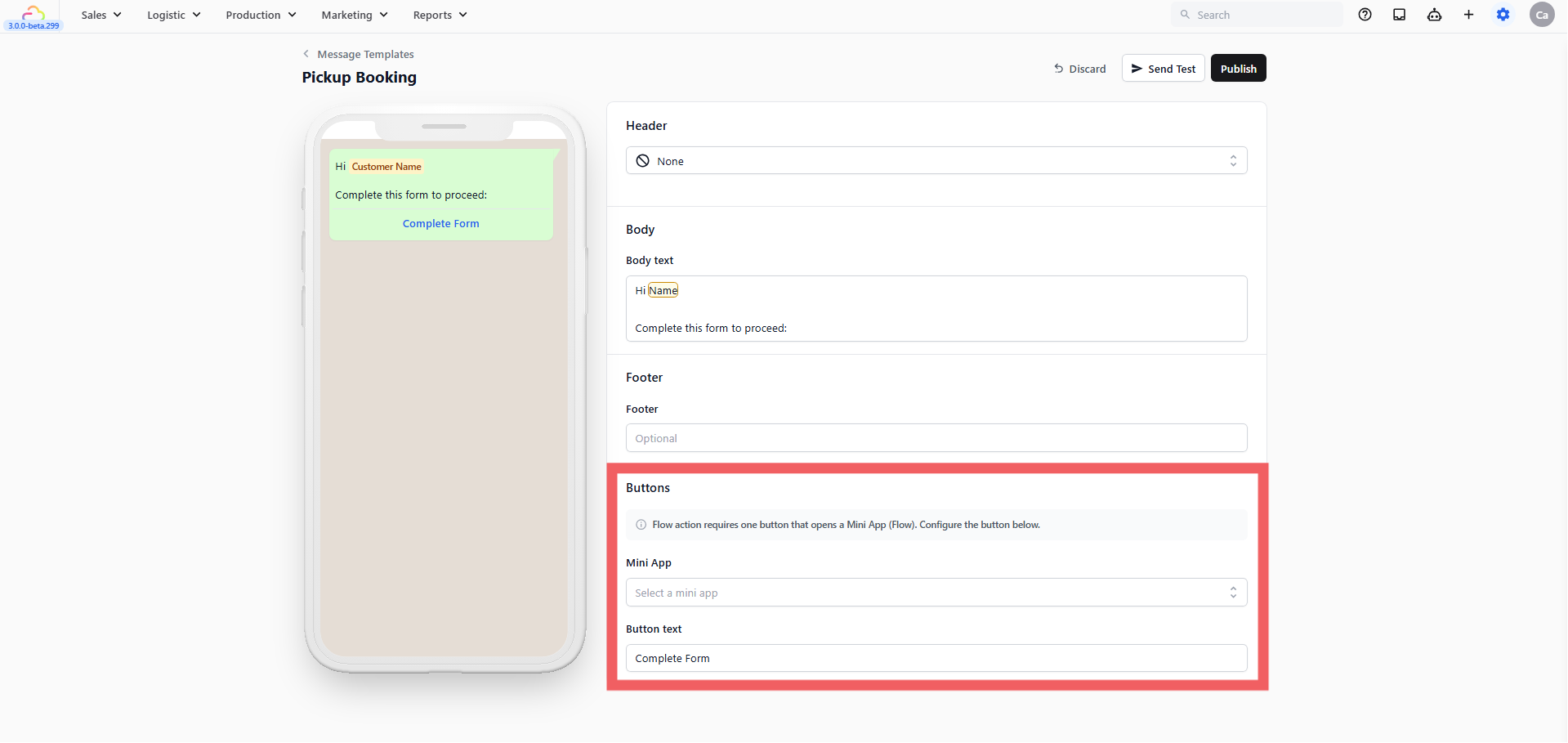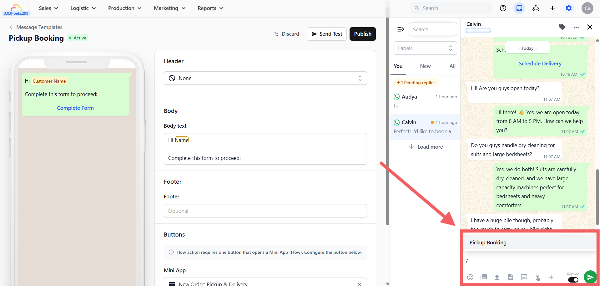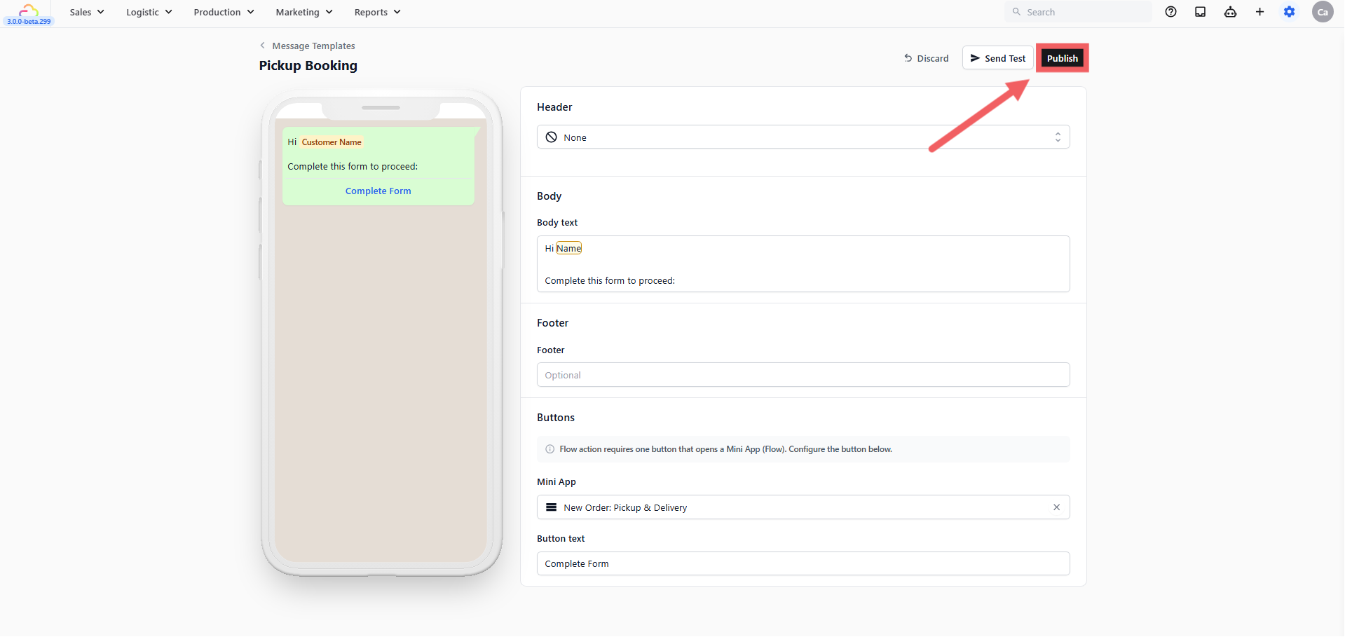 @to easily insert the customer's name automatically (e.g., "Hi @Customer Name, click the button below to book your pickup!"). - Click Publish.