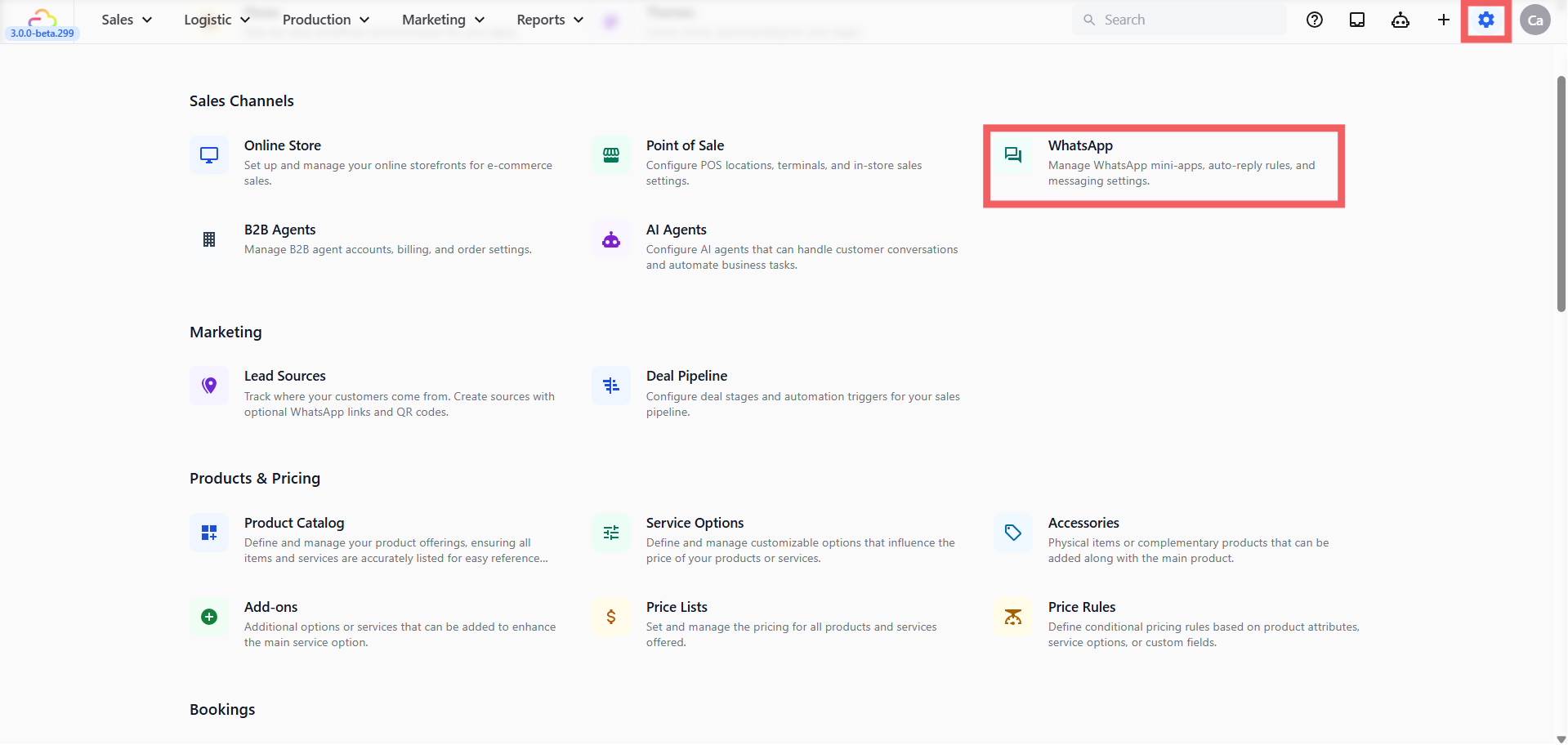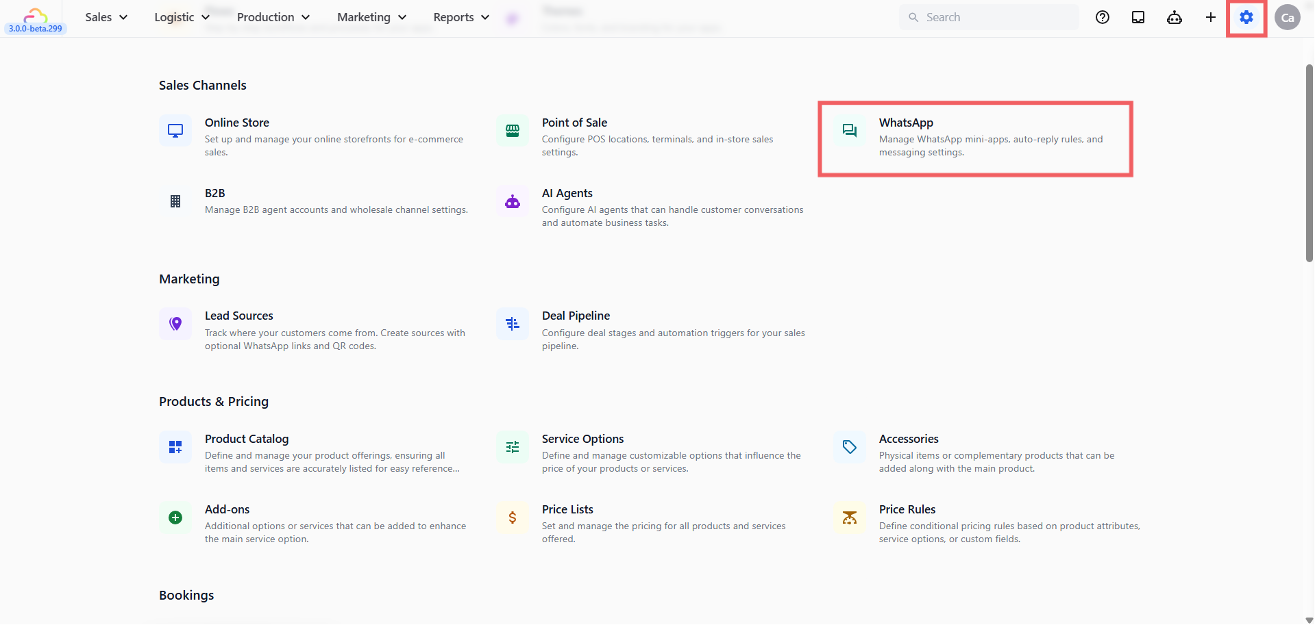 - Under the Sales Channels section, click the WhatsApp card.